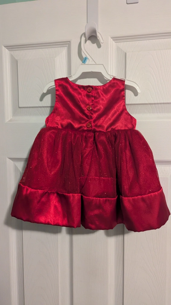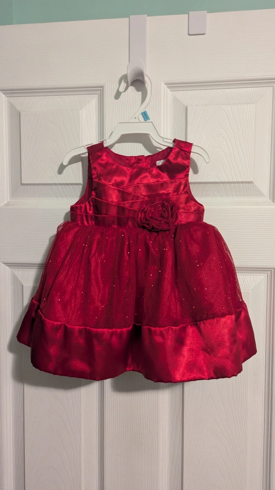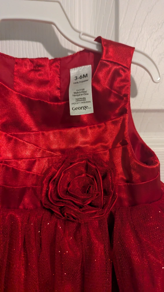 A beautiful red dress for your little one! This George dress is sized for 3-6 month olds and is in great condition. Perfect for special occasions or just looking extra adorable. The dress features a lovely flower detail and a sparkly tulle skirt.