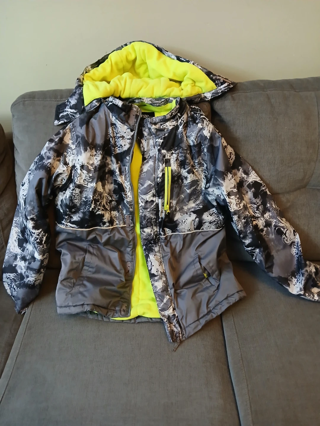 15Selling a George brand boys' winter jacket in size 14/16. It features a stylish grey, black, and white patterned exterior with a bright yellow lining. Perfect for keeping your little one warm and dry this winter!