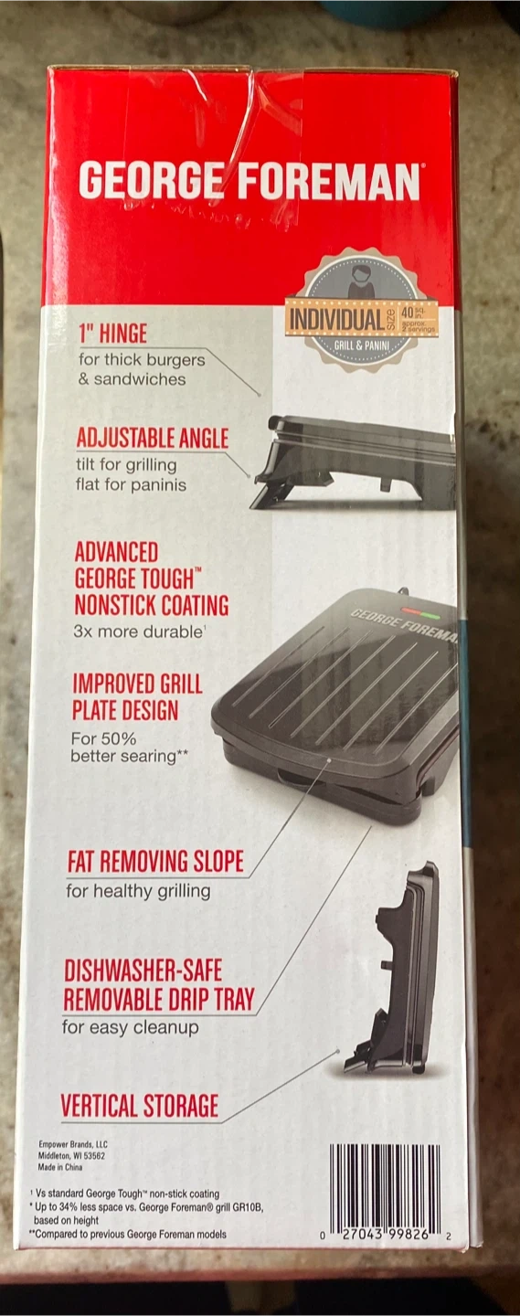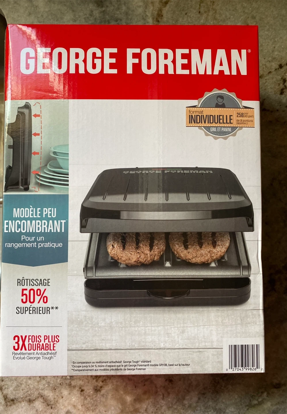 60Selling a brand new George Foreman Individual Grill & Panini press. It's still in the box and has never been used! It's perfect for grilling burgers and making paninis. It has an adjustable angle for grilling flat for paninis. The grill plate design is improved for 50% better searing and it has a fat removing slope for healthy grilling. It also has a dishwasher-safe removable drip tray for easy cleanup
