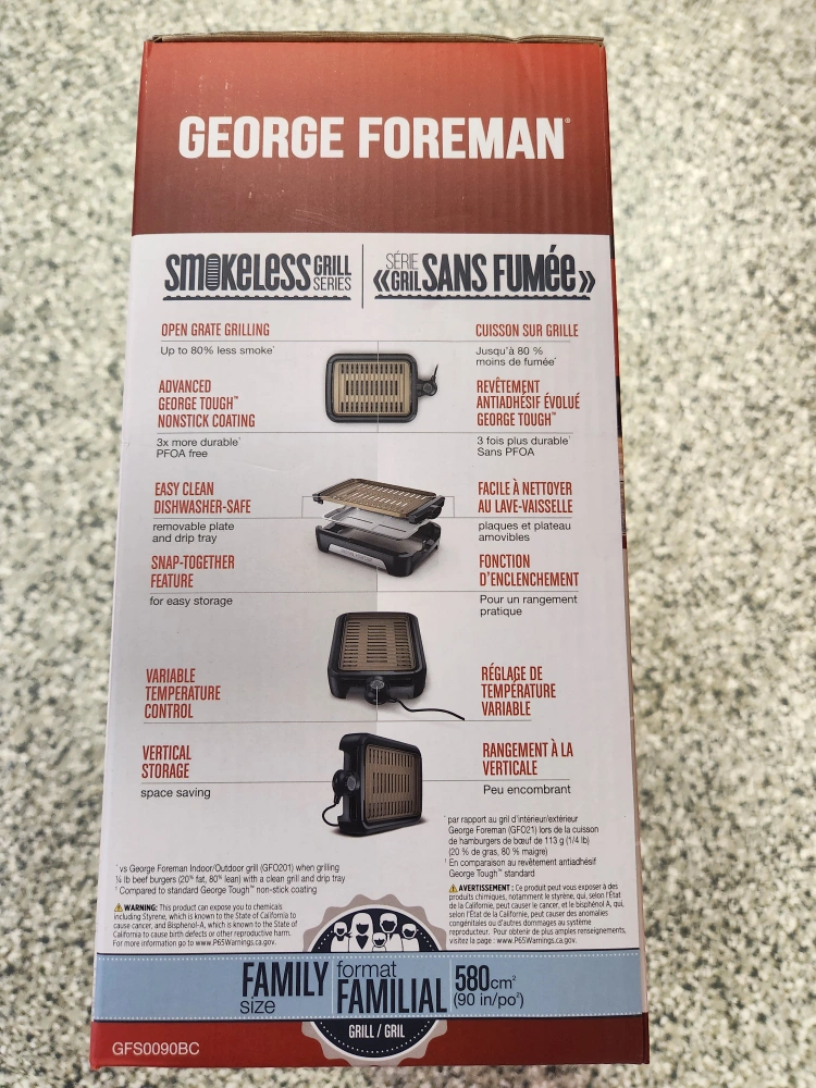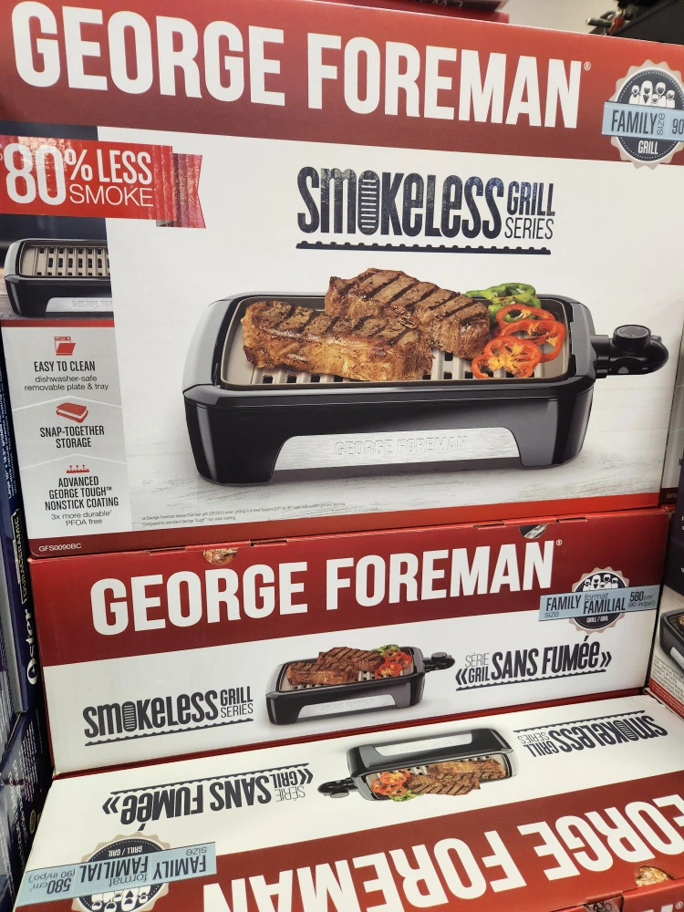 Get ready to grill indoors with this George Foreman Smokeless Grill! It's the family size, perfect for cooking up a delicious meal for everyone. Enjoy up to 80% less smoke compared to standard grills, thanks to its open grate grilling design. The advanced George Tough non-stick coating is 3x more durable and PFOA-free, making it easy to clean. Plus, the removable plate and drip tray are dishwasher-safe for even easier cleanup. The snap-together feature allows for easy storage, saving you space in your kitchen