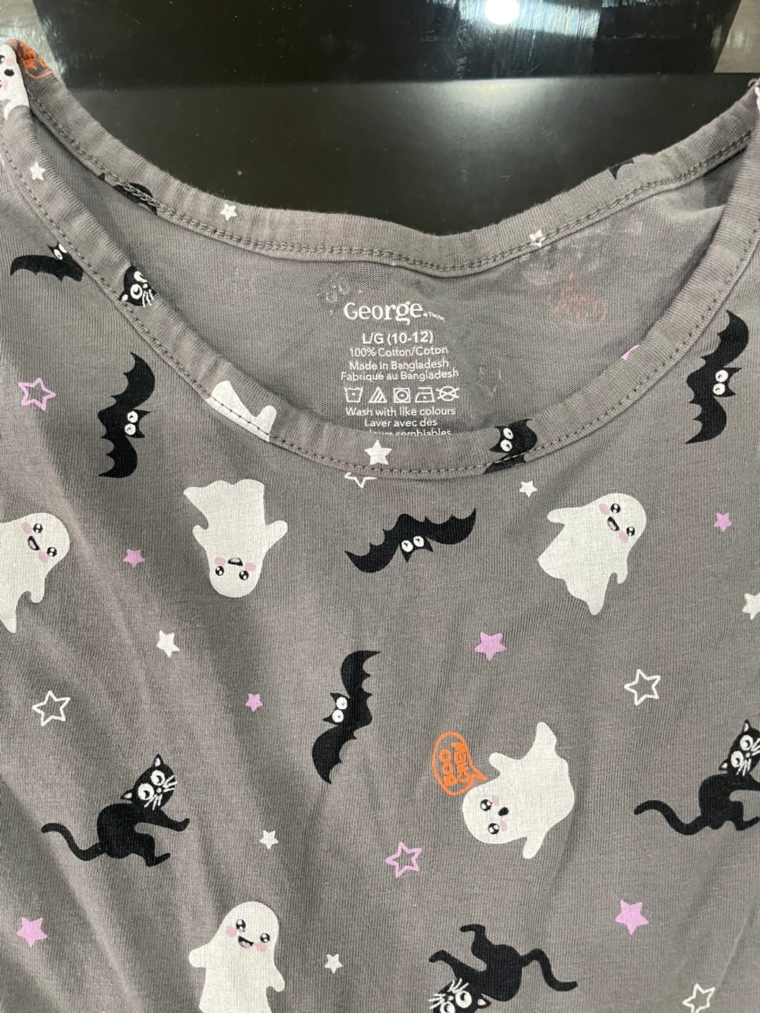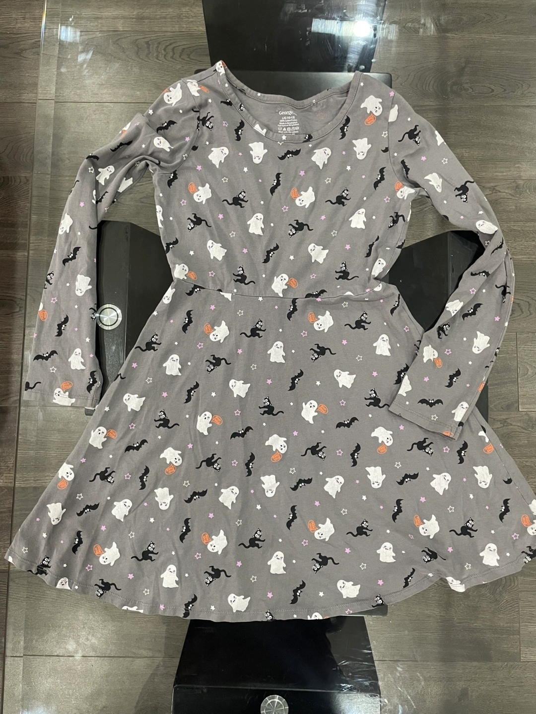 Cute Halloween dress from George in size L (10-12)! It features a fun pattern with ghosts, bats, stars and black cats on a grey background. Perfect for the spooky season. Smoke free home.