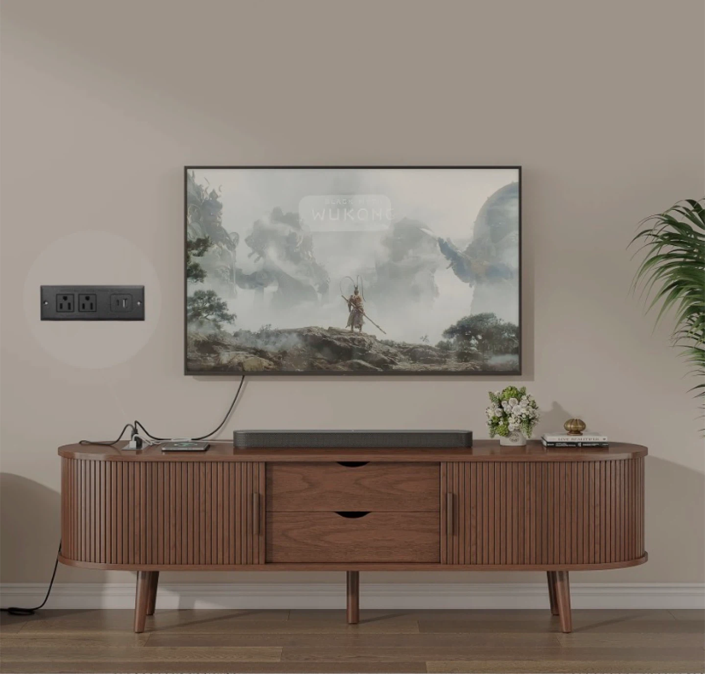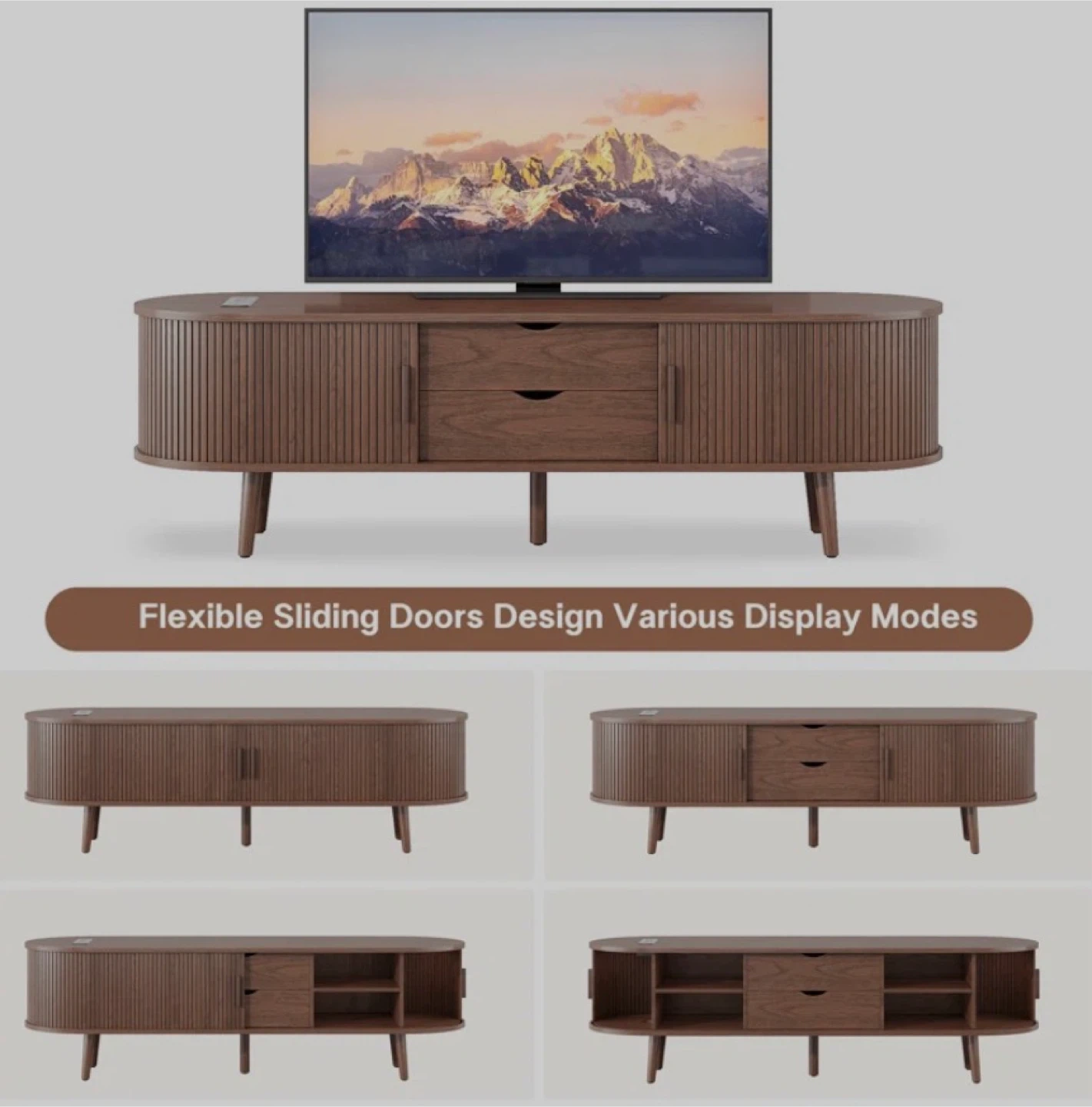 RETAIL PRICE: 400+ tax Here's a stylish brown oval TV stand with a unique flexible sliding door design! It offers various display modes to suit your needs. Perfect for adding a touch of elegance to your living room or entertainment area