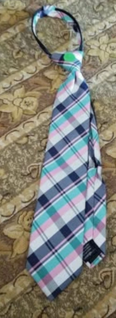 27Selling a George brand tie in a lovely plaid pattern. The colours are pink, teal, and navy. It's made of 100% polyester