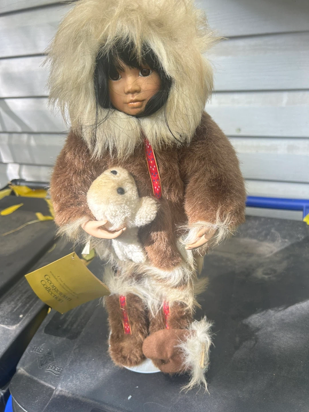 60Selling a Georgetown Collection Eskimo doll. This doll is part of the Georgetown Collection and features a detailed Eskimo outfit with fur trim and holds a small stuffed animal. The doll is in good condition and would be a great addition to any doll collection
