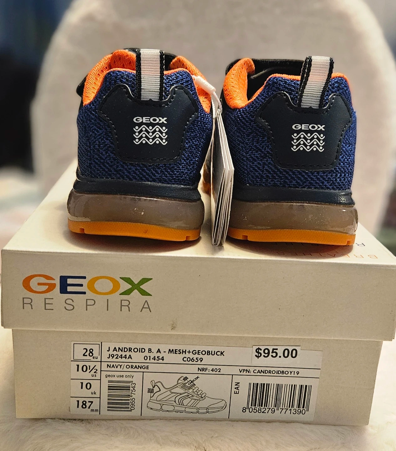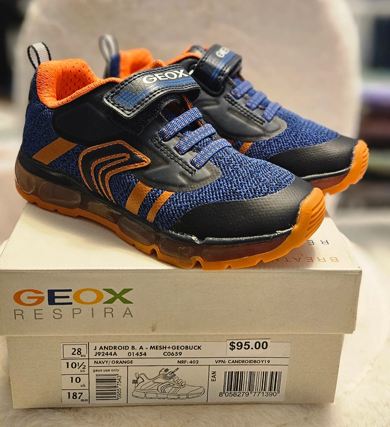 131BNIB Geox Android B. A -Mesh+Geobuck kids shoes in navy and orange! These are size 10.5 US. Originally bought for $95.00 and come with the box
