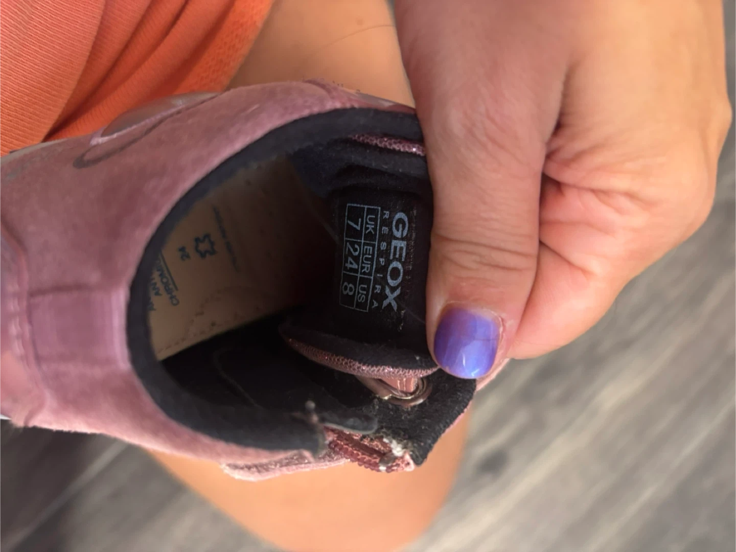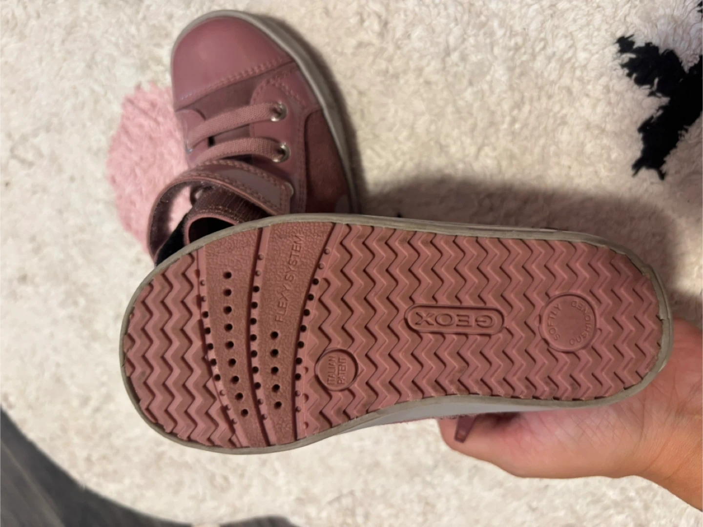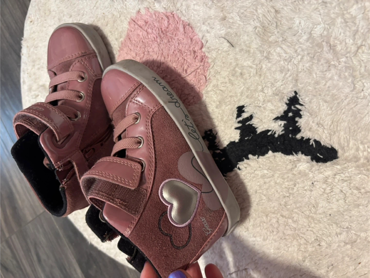 These cute Geox toddler shoes are in a lovely pink colour and are a size US 7! They have a heart design on the side and a convenient velcro strap, perfect for little ones learning to dress themselves