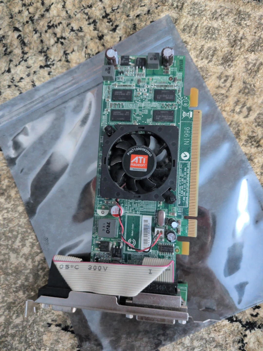 This is an ATI Radeon graphics card with a fan. It uses a PCI interface. P/N7120036200G