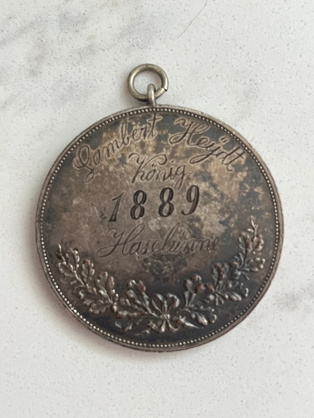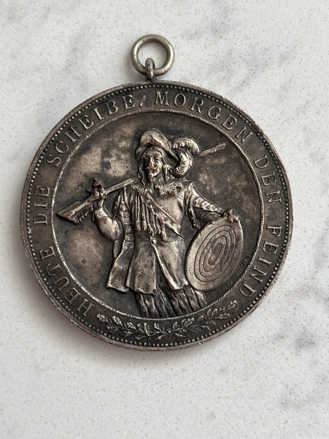 The medal in the image appears to be a German shooting medal, likely from a competition or commemorative event, potentially around the early 20th century, given the style and similar examples found. Determining the exact value of such a medal requires expert appraisal, as factors like condition, rarity, specific historical significance, and material composition (e.g., silver content) significantly influence its market price. However, based on similar items found in numismatic auctions and sales, the value of German shooting medals can vary widely. For instance: A "Deutsches Reich SCHÜTZENMEDAILLE" (German Empire Shooting Medal) from a 1914 officers' shooting competition sold for a certain value, indicating that medals from specific events and with clear provenance can be collectible.
