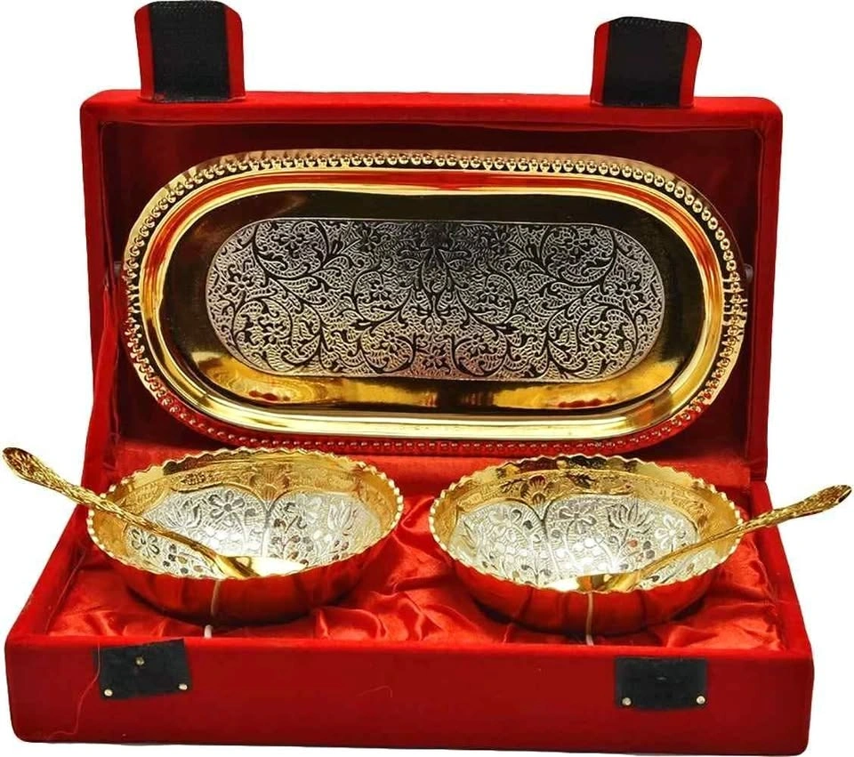 5 PC set German silver Velvet box packing 2 bowls ,2 spoons ,1 tray