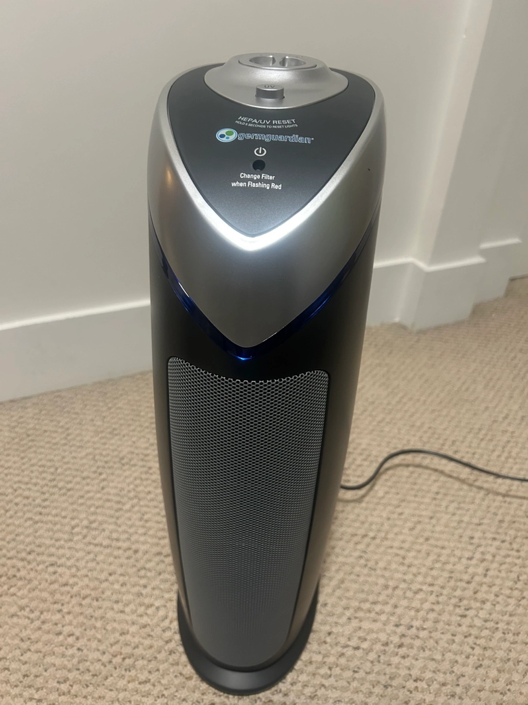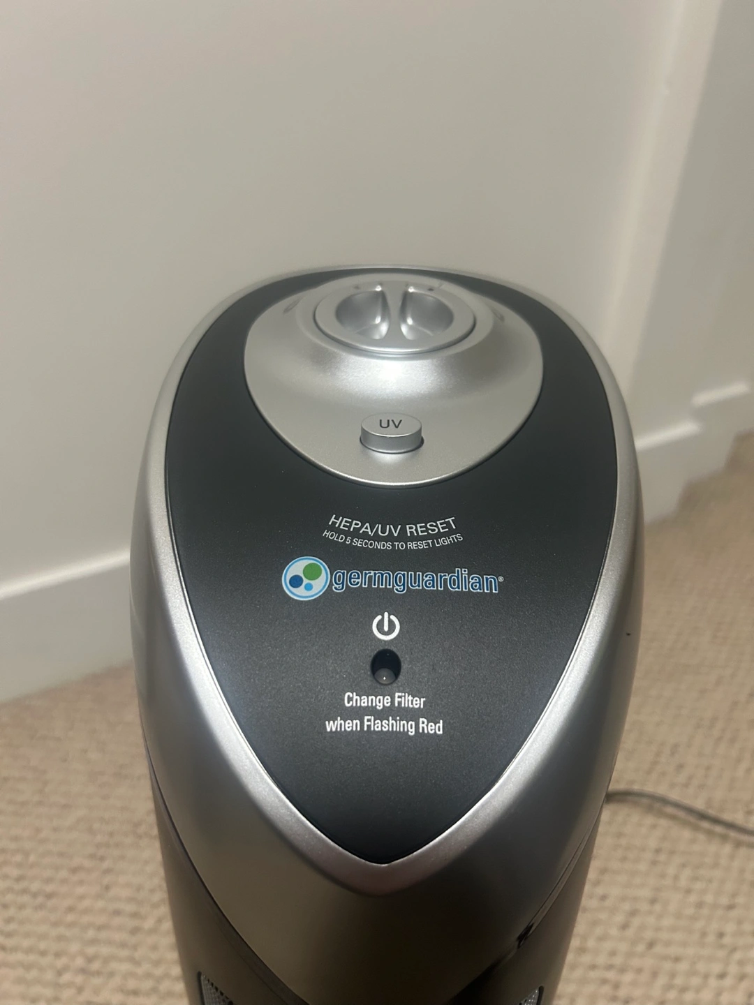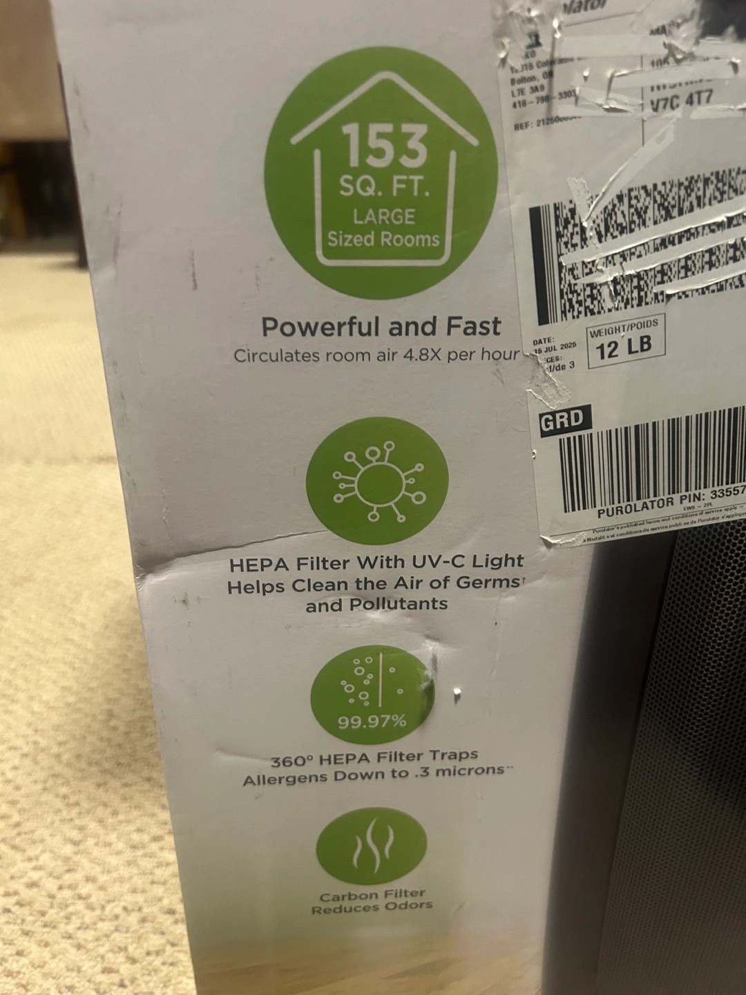 60GermGuardian air purifier! It's designed for large sized rooms up to 153 sq ft. The HEPA filter with UV-C light helps clean the air of germs and pollutants, and the carbon filter reduces odours. It circulates room air 4.8 times per hour. New in the box.