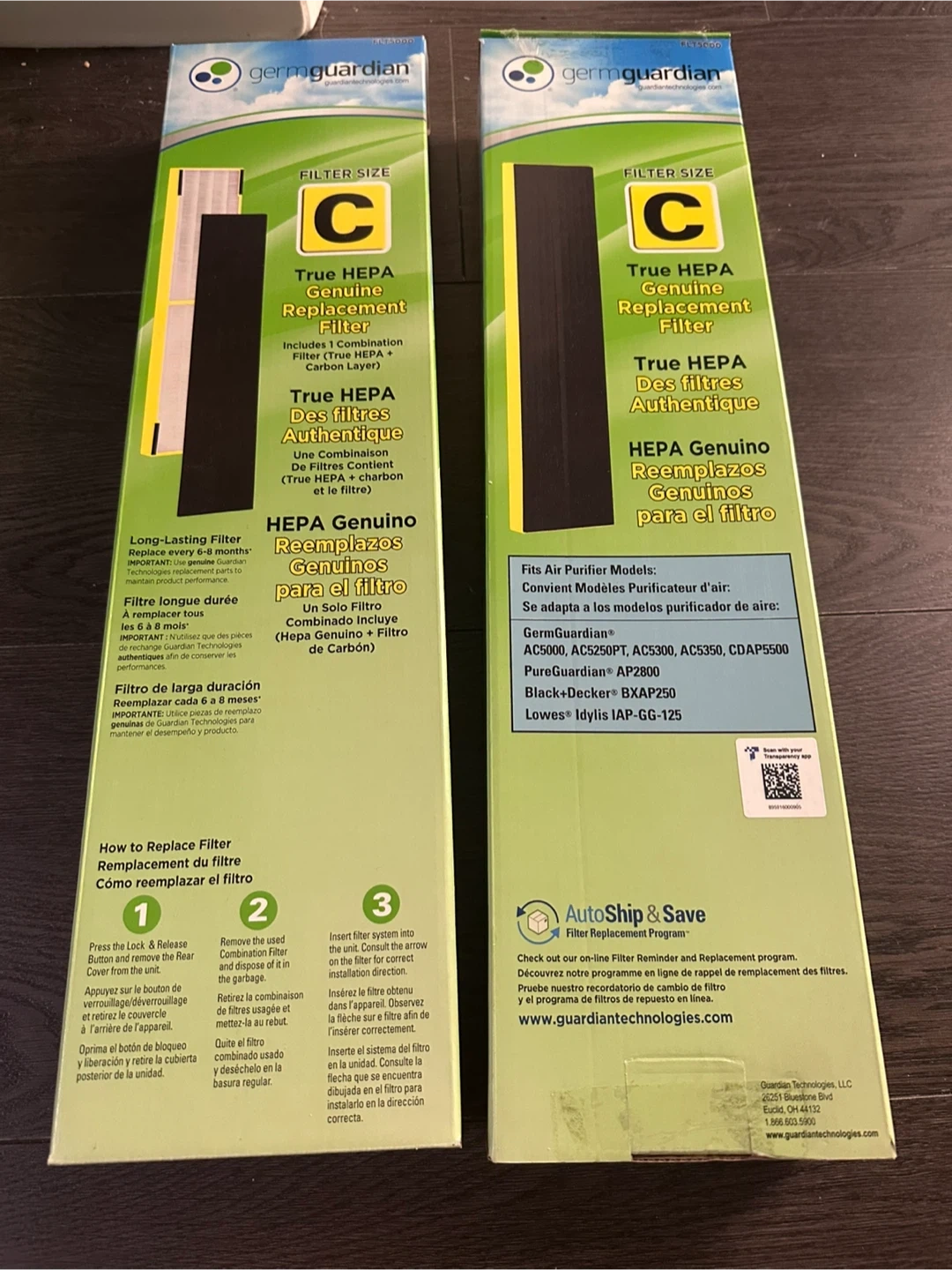Selling a GermGuardian True HEPA Genuine Replacement Filter, size C. It's a combination filter with True HEPA and charcoal filter layers. Fits air purifier models AC5000, AC5250PT, AC5300, AC5350, CDAP5500, PureGuardian AP2800, Black+Decker BxAP250, and Lowe's Idylis IAP-GG-125