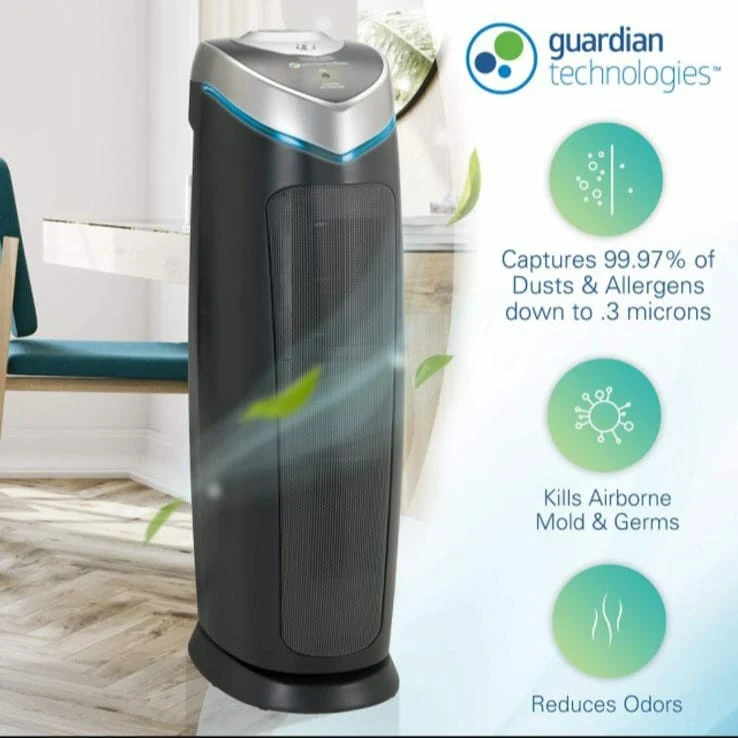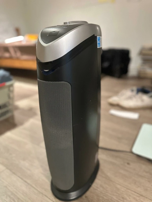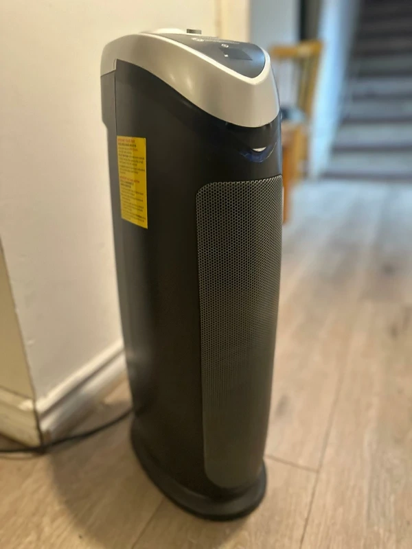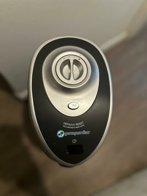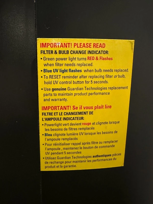 Selling a GermGuardian HEPA UV air purifier. It has a filter and bulb change indicator. The green power light turns red and flashes when the filter needs to be replaced, and the blue UV light flashes when the bulb needs replacing. To reset the reminder after replacing the filter or bulb, hold the UV control button for 5 seconds. OBO