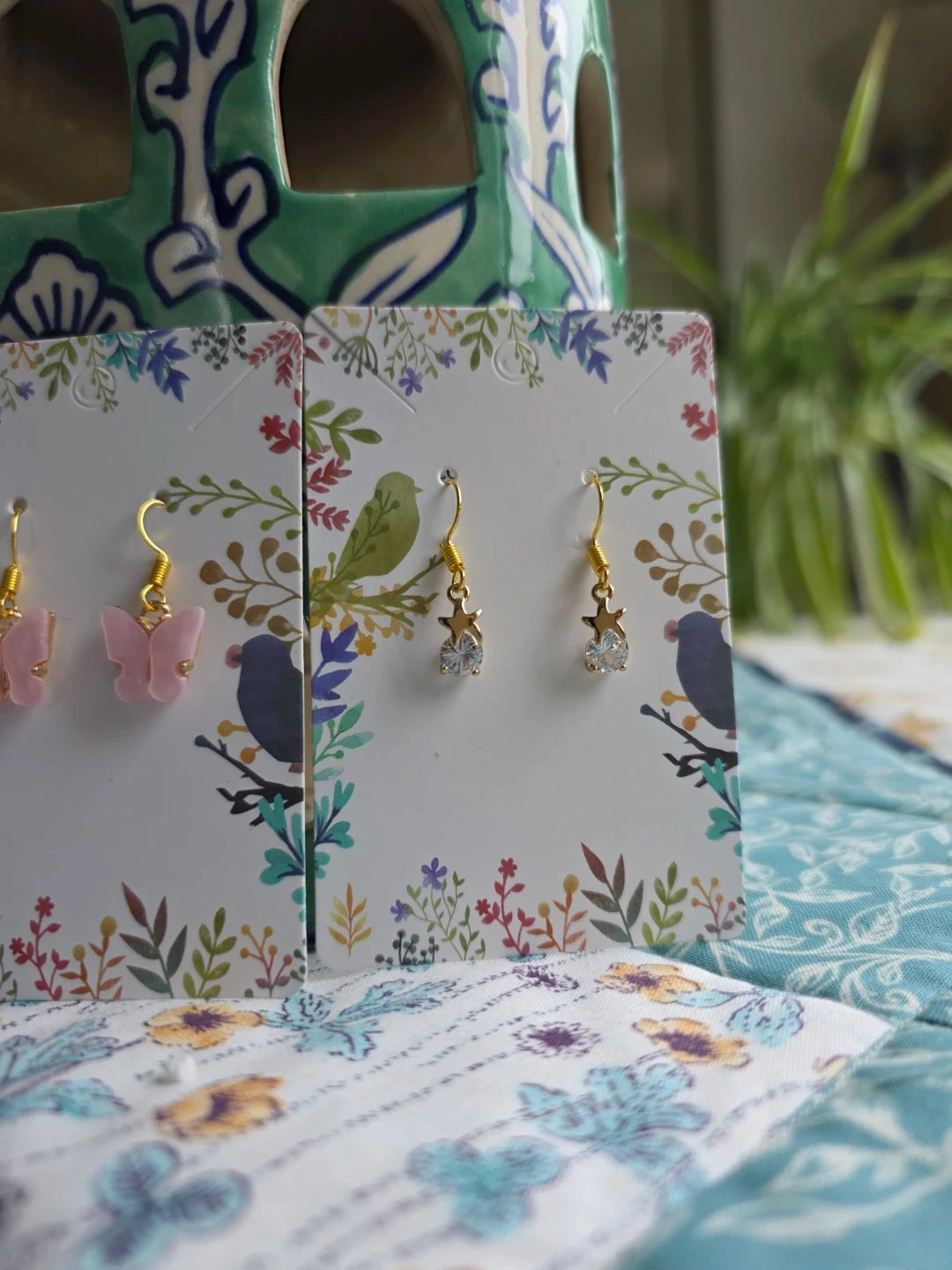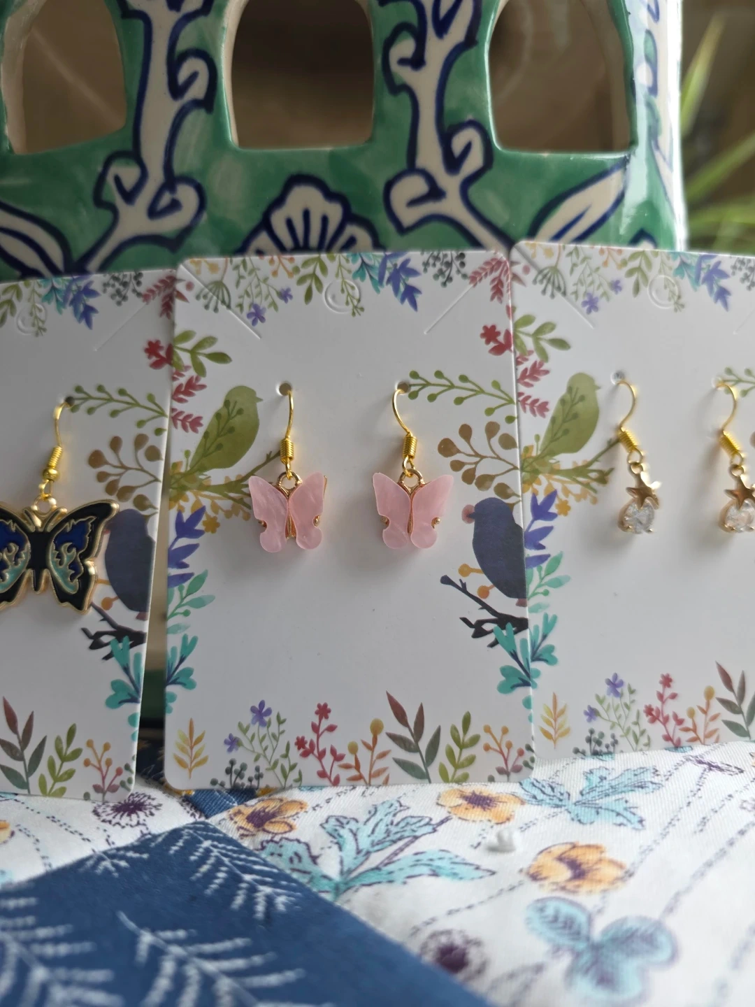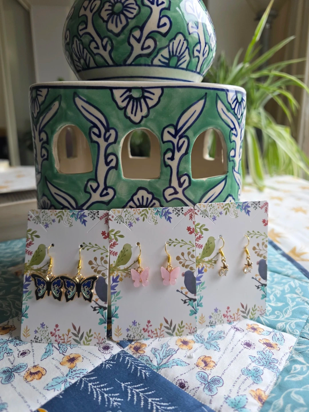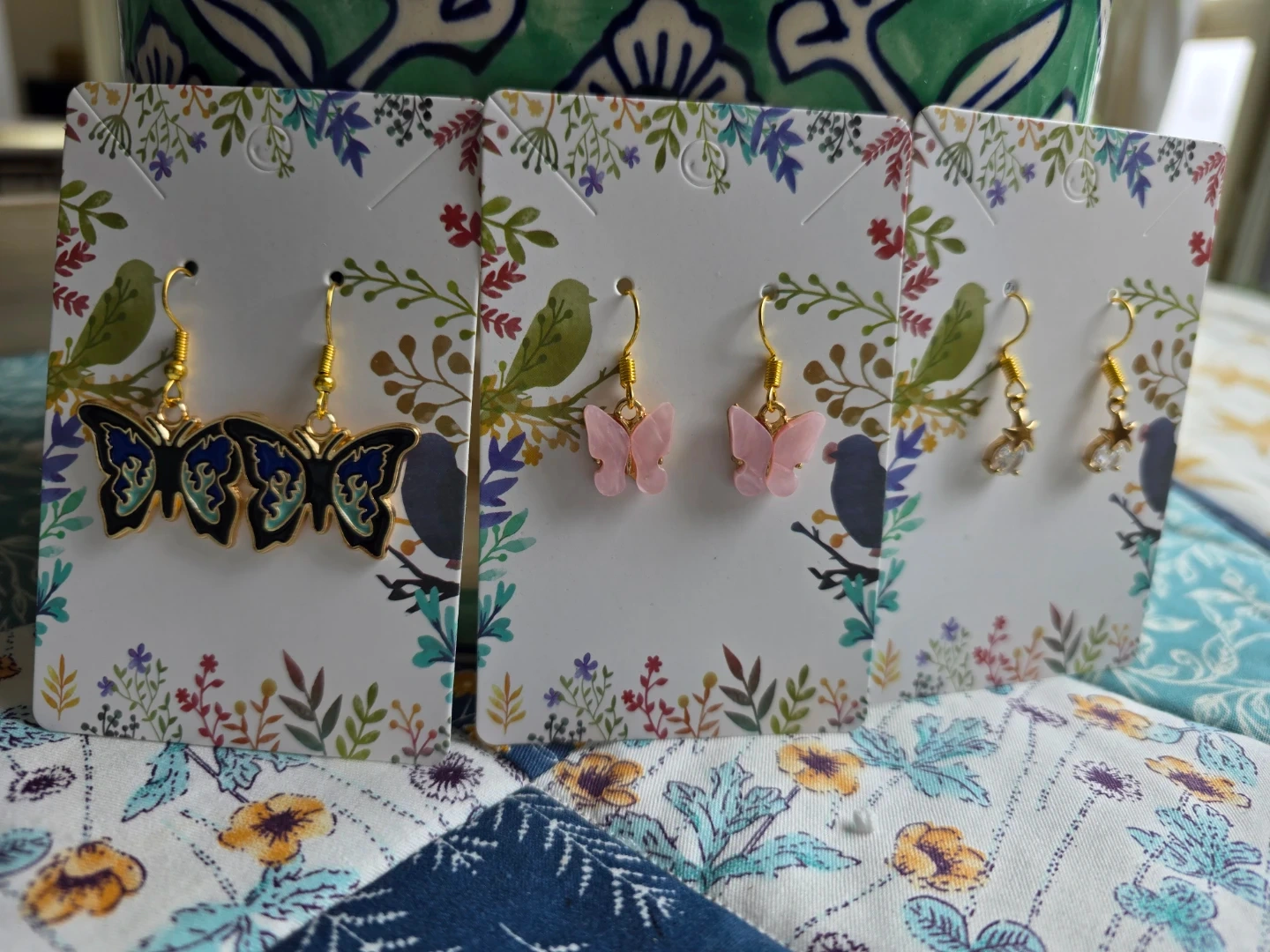A set of three pairs of dangle earrings, including two butterfly designs (one blue, one pink) and one pair with clear crystal charms. All earrings feature gold-tone hooks.