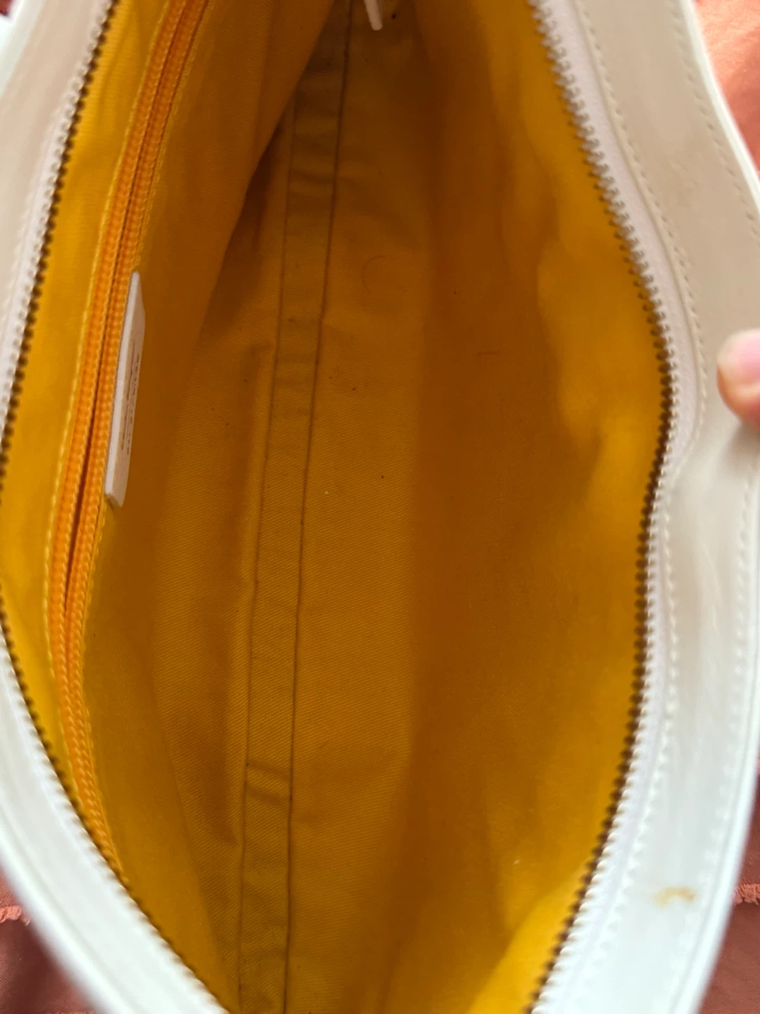 Salvatore Ferragamo white leather shoulder bag. It features a secure clasp closure and an interior zip pocket. The bag has a classic design with gold hardware accents & yellow interior lining