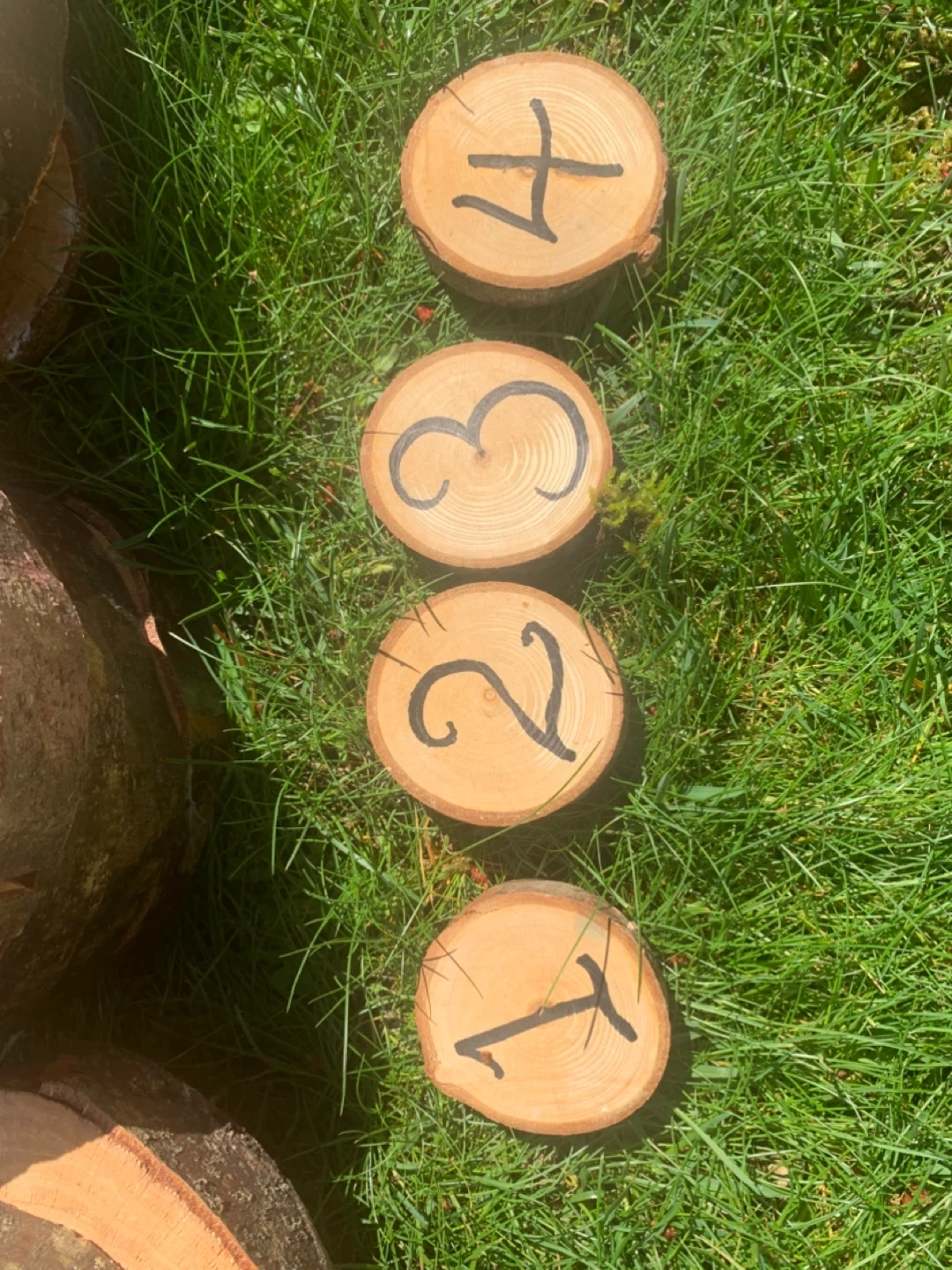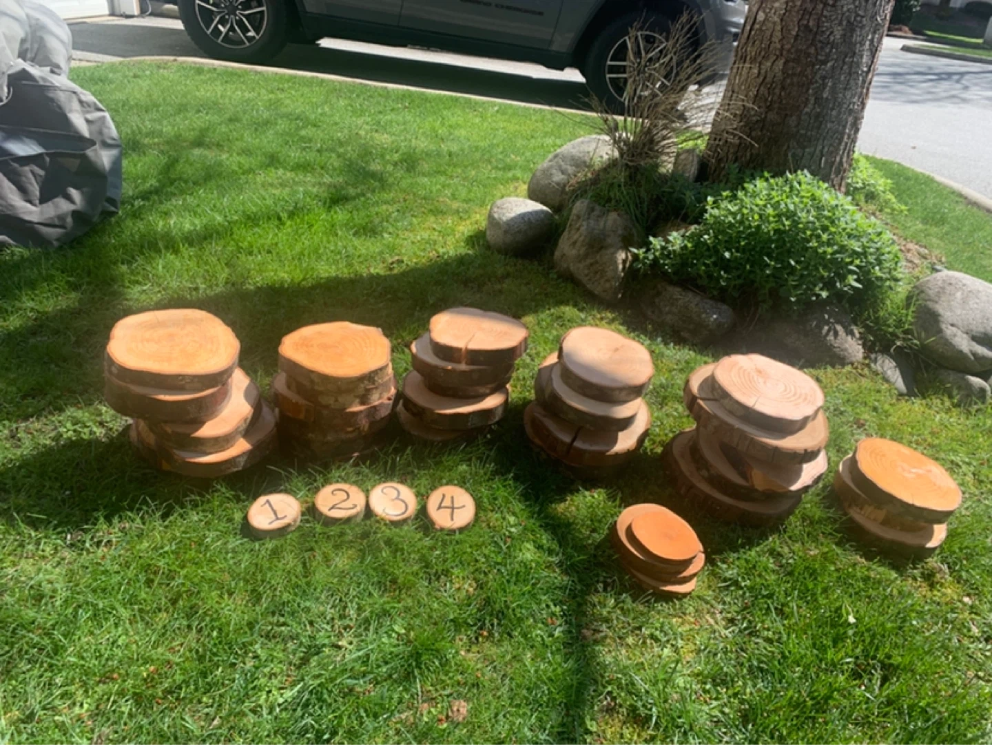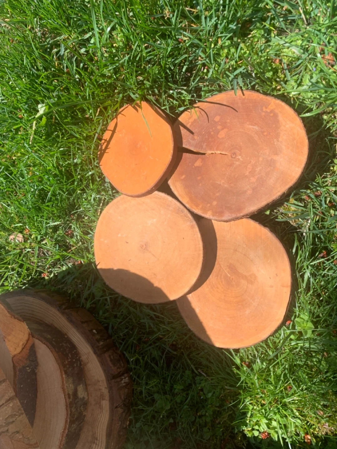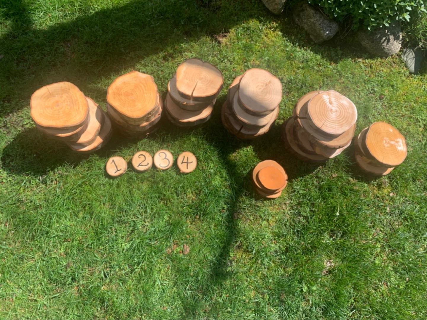 Set of handmade natural wood slices. 33 wooden centrepieces, 4 small and thin slices and 4 mini slices numbered 1-4 (ideal for table numbers). Previously used for wedding decor. Great condition. Must take all.