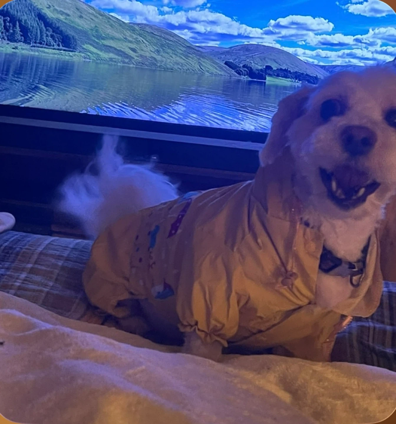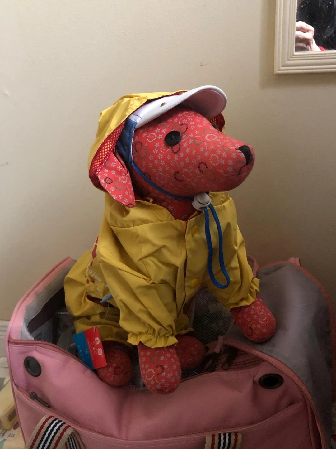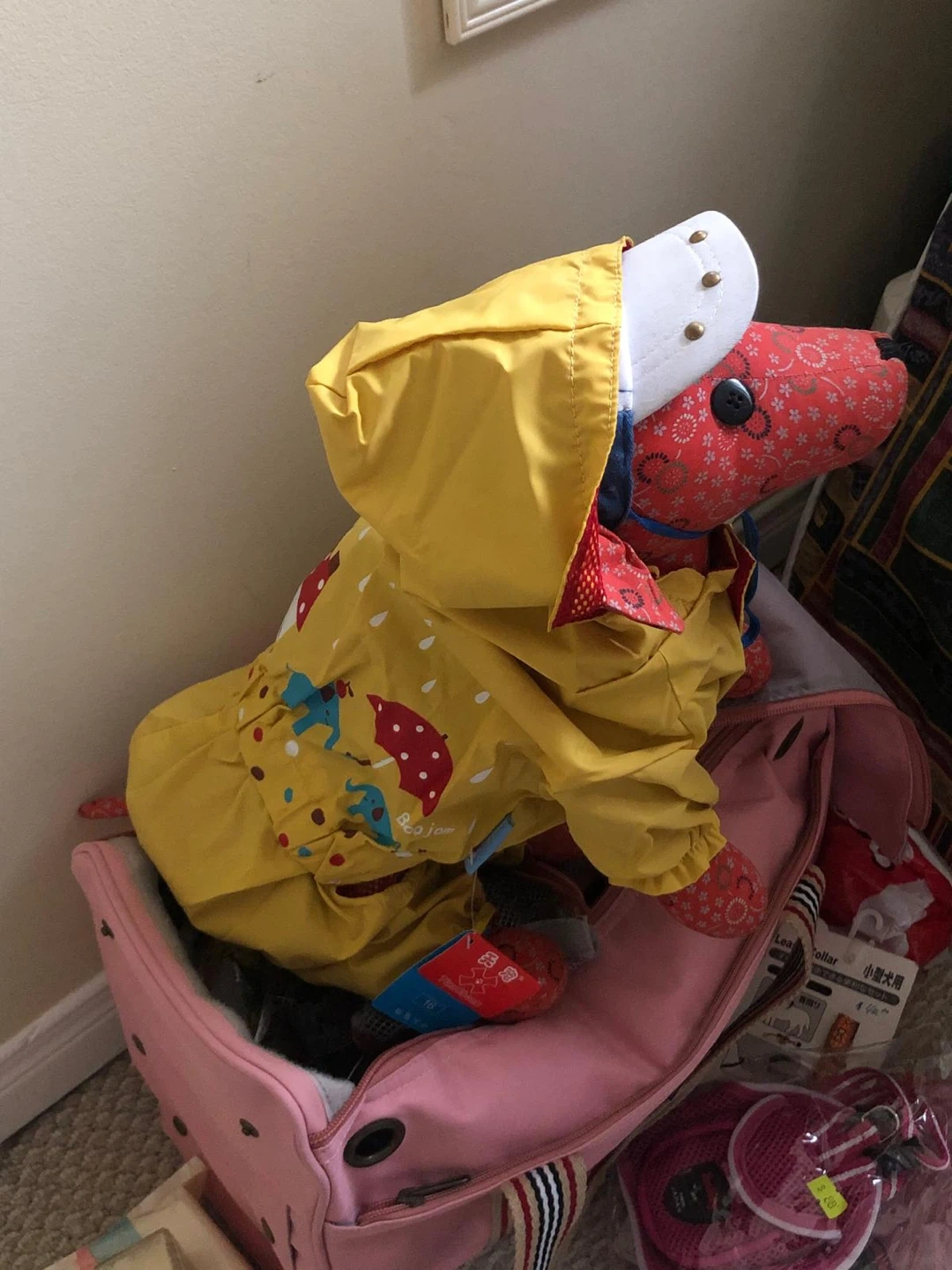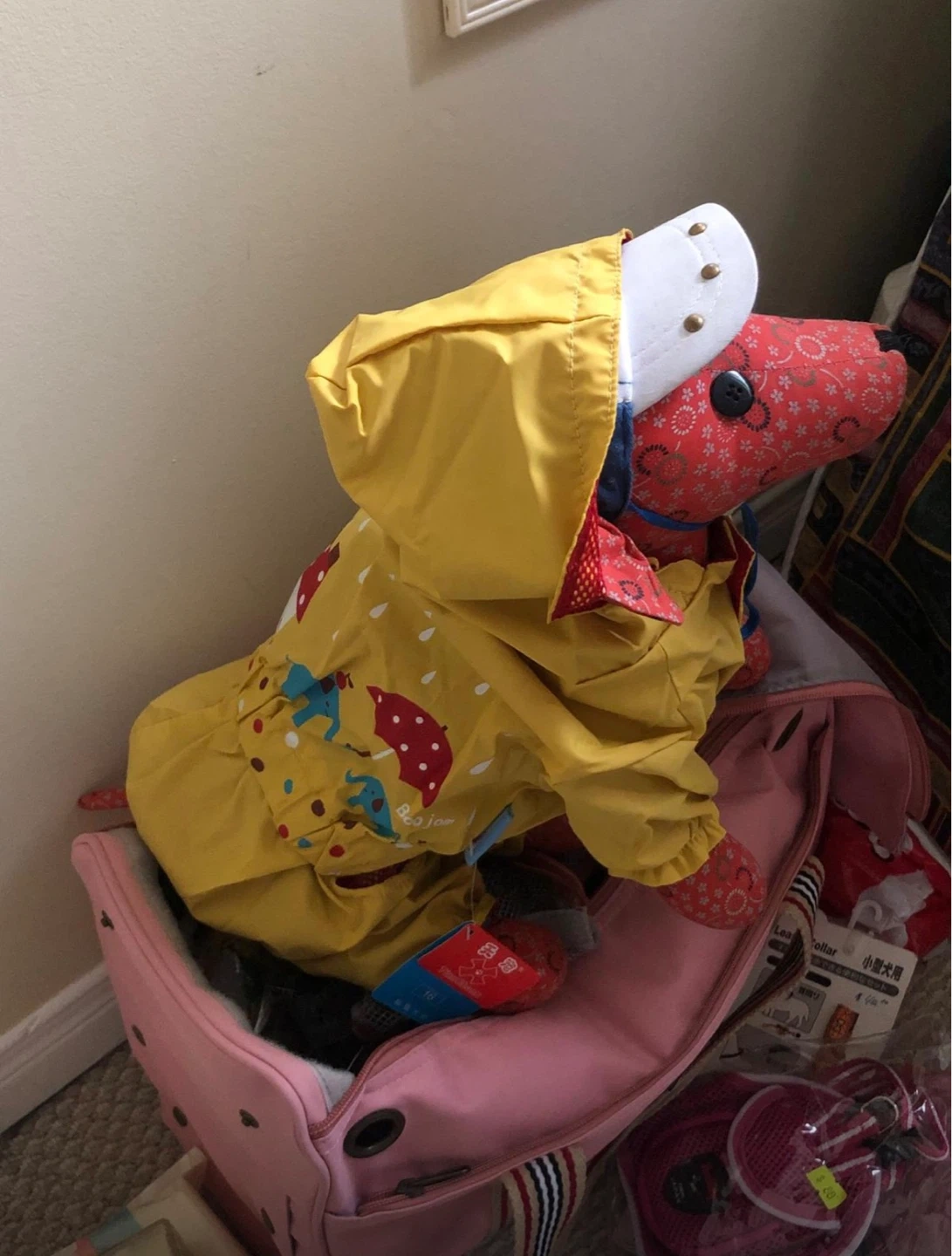 Cute yellow raincoat for your dog, complete with a hood. Features a charming pattern of umbrellas and raindrops. Made from waterproof material to keep your pet dry on rainy days!