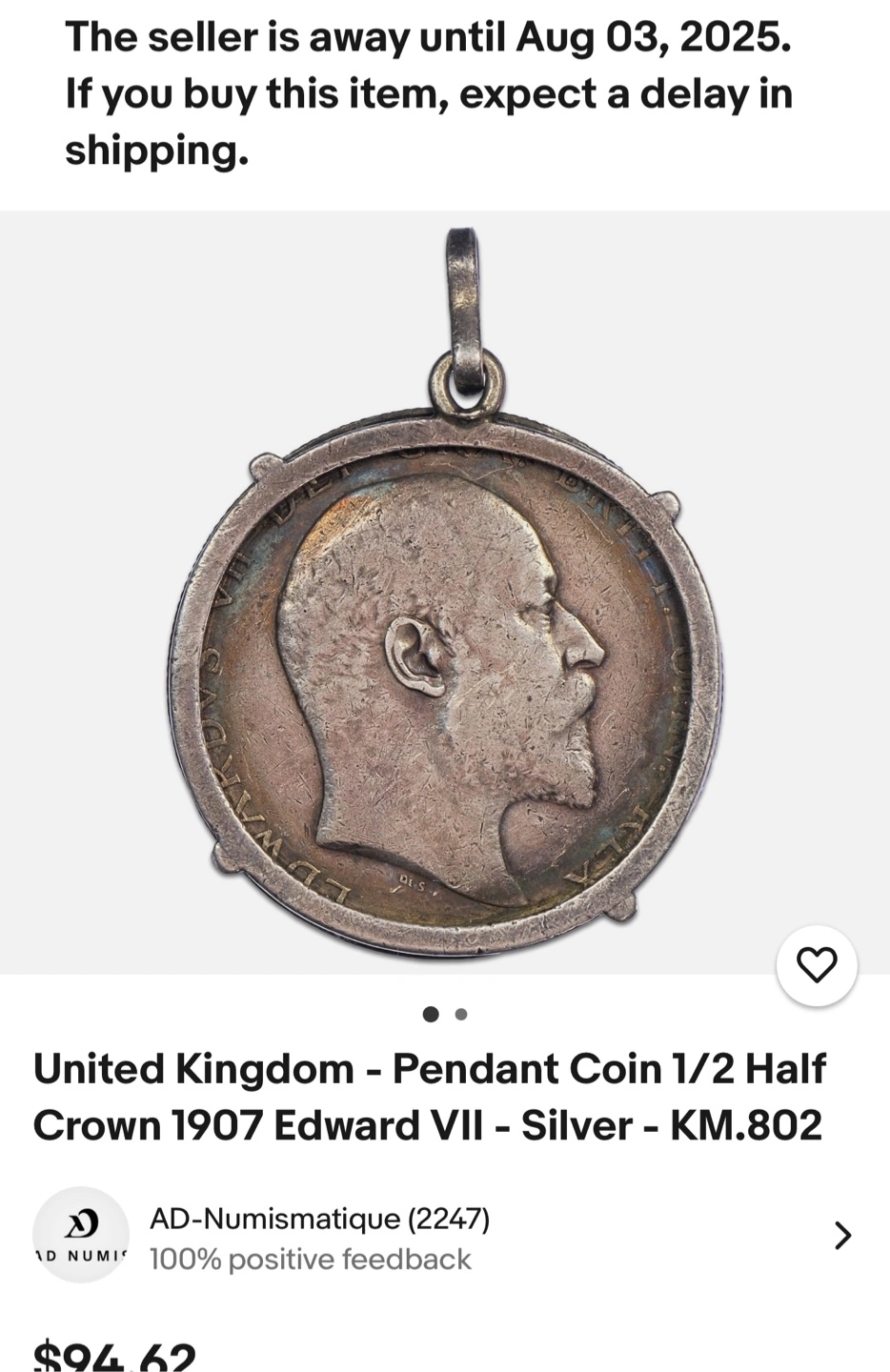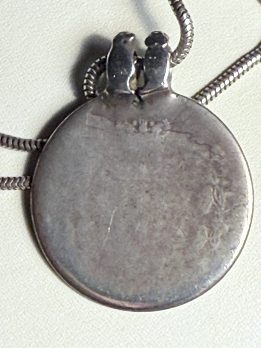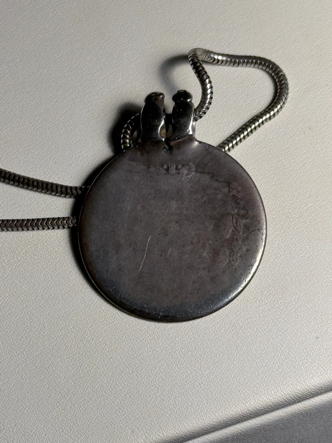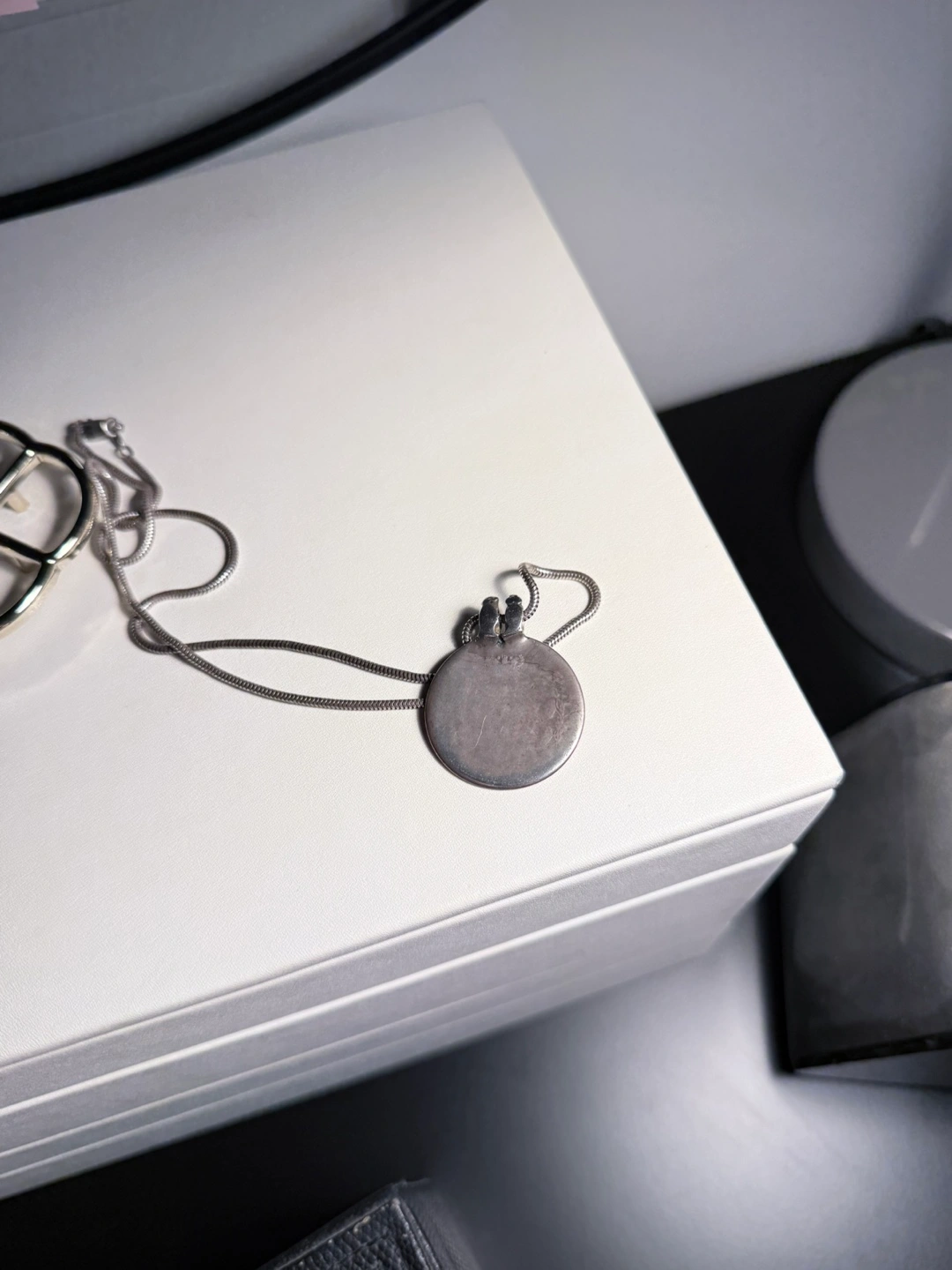 Selling a sterling silver vintage coin pendant necklace. The pendant features a profile of a man on one side, giving it a unique and historical look. The chain is a delicate snake chain, complementing the pendant nicely. It's a great piece for adding a touch of vintage charm to any outfit
