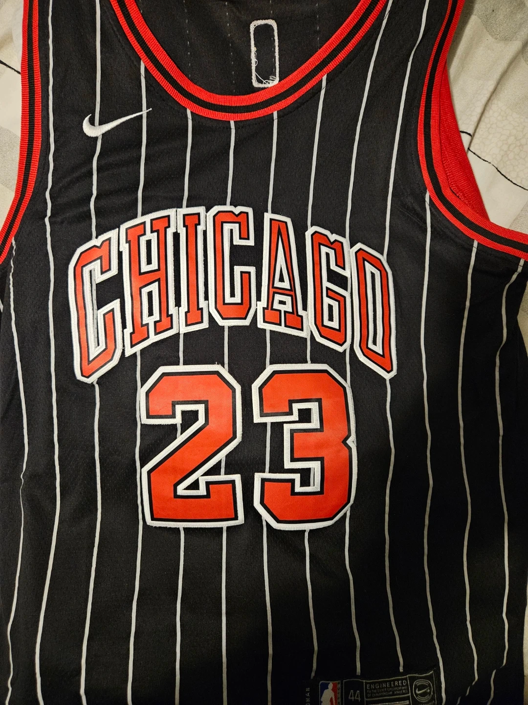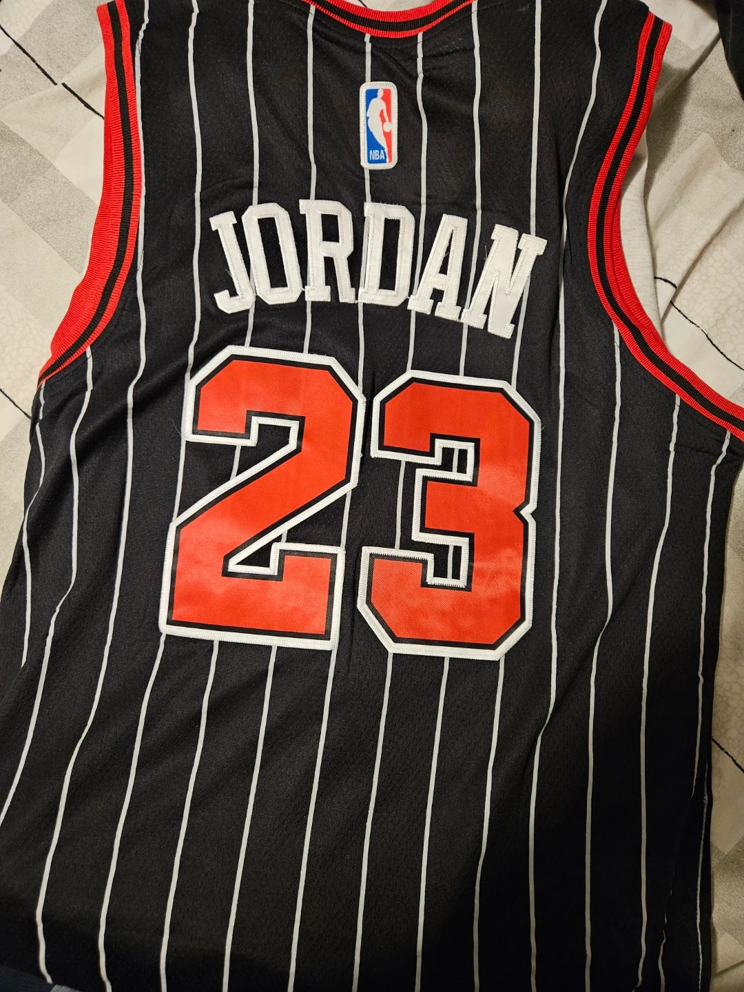 This is a Chicago Bulls jersey featuring Michael Jordan's name and number 23. It's black with red and white pinstripes. The NBA and Nike logos are visible.
