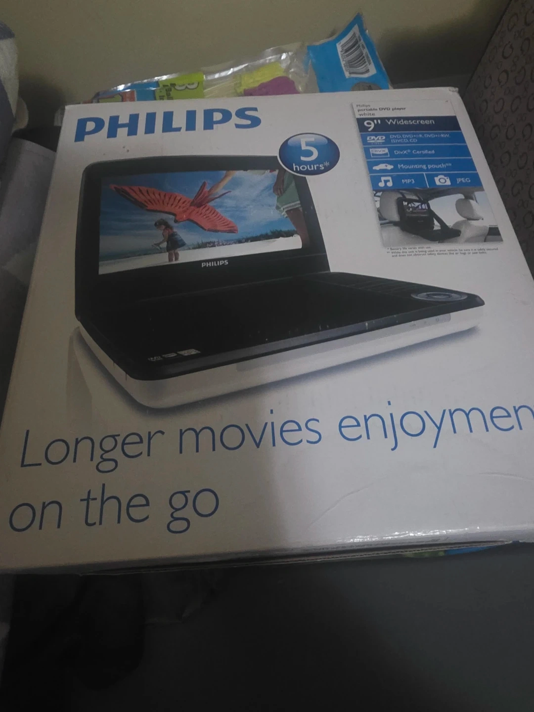 This Philips portable DVD player has a 9" widescreen display. It's DivX Certified and supports DVD, DVD+R, DVD+RW, CD, MP3, and JPEG formats. It offers up to 5 hours of playback on a single charge and comes with a mounting pouch.