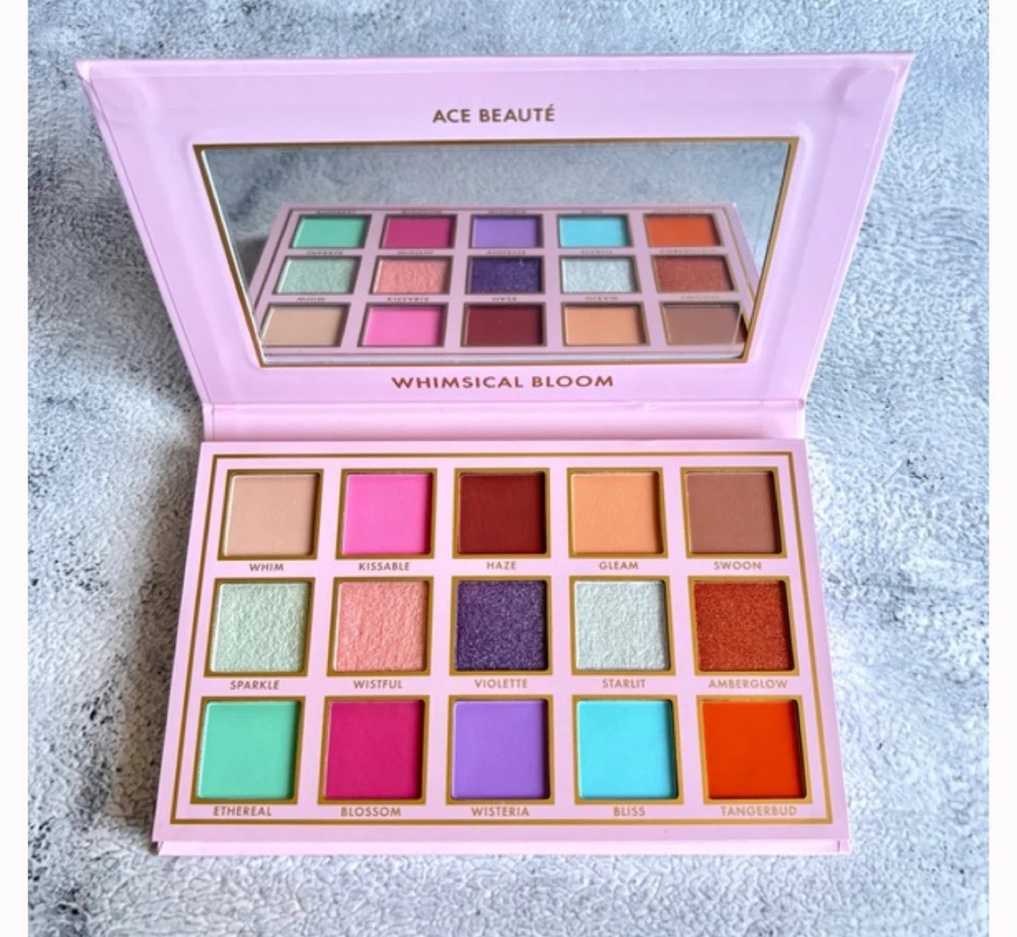 ACE BEAUTÉ Whimsical Bloom eyeshadow palette with 15 shades. Includes a variety of finishes and colours. It has a mirror inside. NEW UNTOUCHED i got this as a gift but the colour story is not for me. Retail price is near $39.99 usd .