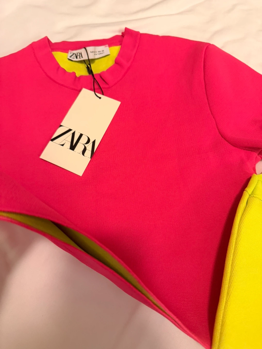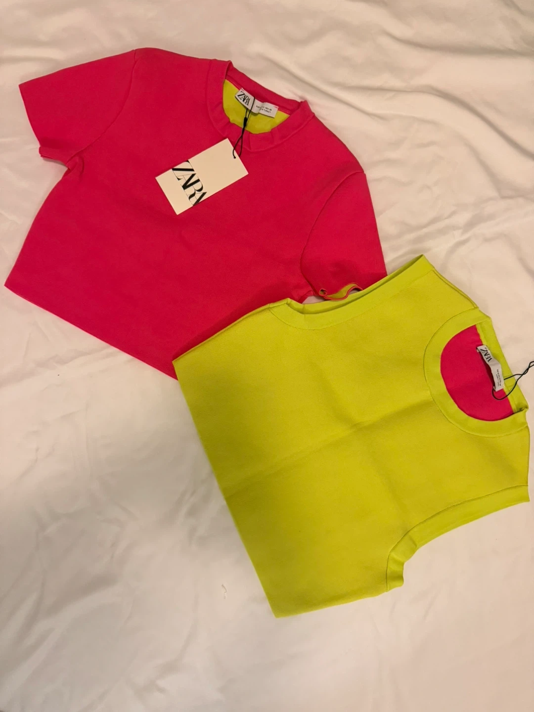 Bright and bold cropped t-shirt set from Zara. One top is neon pink with a neon yellow trim, and the other is neon yellow with a neon pink trim. Made for a stylish, eye-catching look!