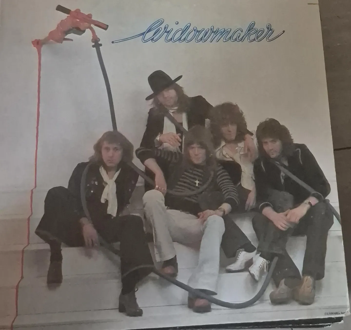Widowmaker album cover art. Features the band members on stairs with a dripping hose graphic. A classic rock album for any collection!