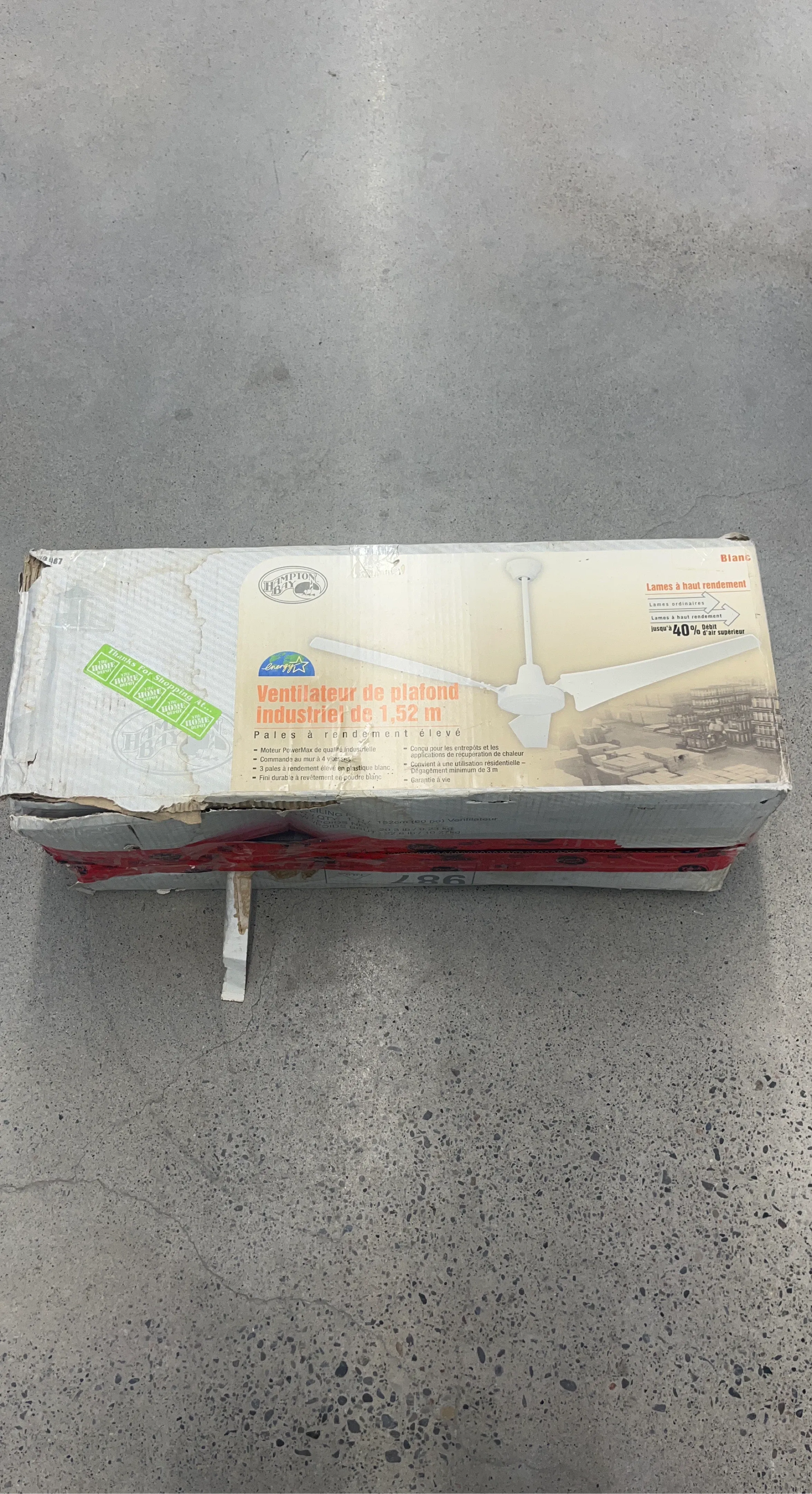 This white Hampton Bay industrial ceiling fan measures 1.52 m (60 inches). It features a PowerMax motor and 3 high-yield white plastic blades. Designed for warehouses and heat recovery applications, it's also suitable for residential use with a minimum 3 m clearance. It offers up to 40% superior airflow.