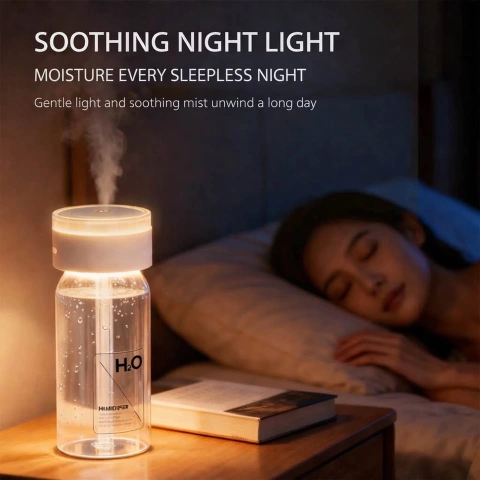 Keep the air comfortably moisturized anytime, anywhere with this compact wireless humidifier. Designed with a minimalist H2O bottle style, itβs perfect for bedrooms, offices, nurseries, and travel.