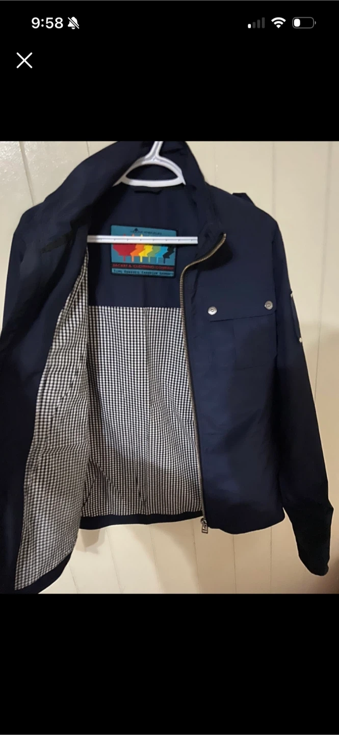 This is a Moose Knuckles jacket in navy. It features a checkered lining inside and multiple buttoned pockets. This jacket is from the Jacket & Clothing Company.