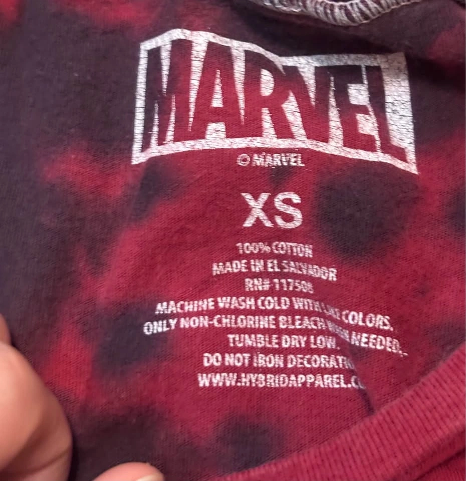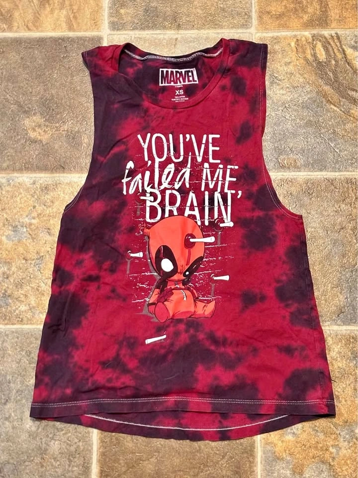Brand: Marvel (Hybrid Apparel). Design: "You've Failed Me, Brain" graphic with Deadpool logo. Style: Sleeveless tank top / muscle tee. Color: Striking Red & Black Tie-Dye. Size: XS (Extra Small) — True to size, with a comfortable knit feel.