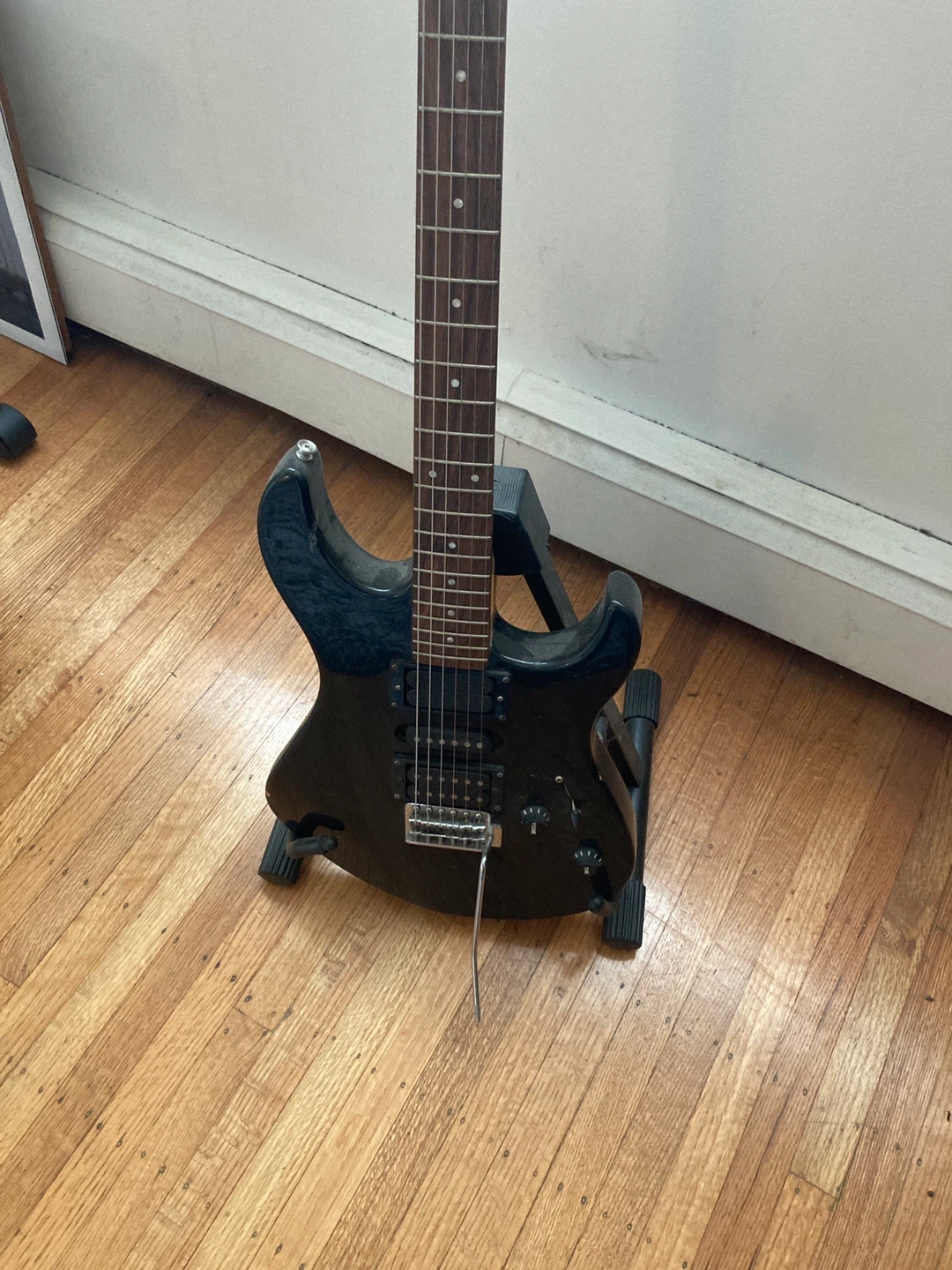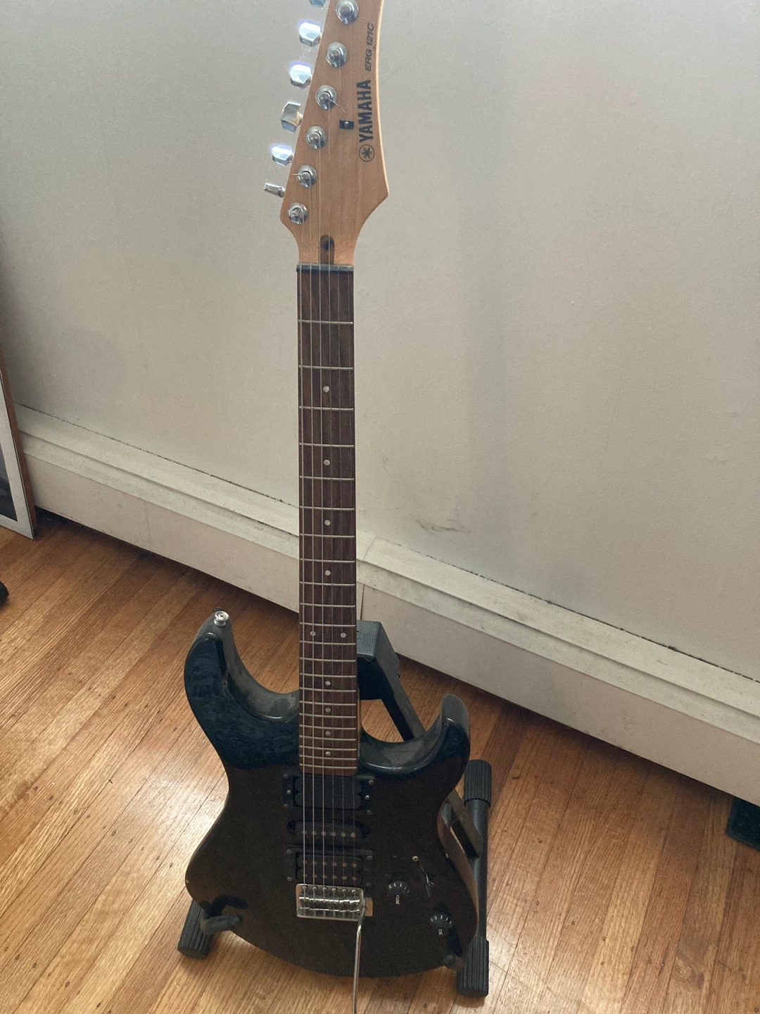 This black Yamaha electric guitar has a maple neck and rosewood fingerboard. It's in good condition and ready to play! It's a great option for beginners or intermediate players looking for a reliable instrument.