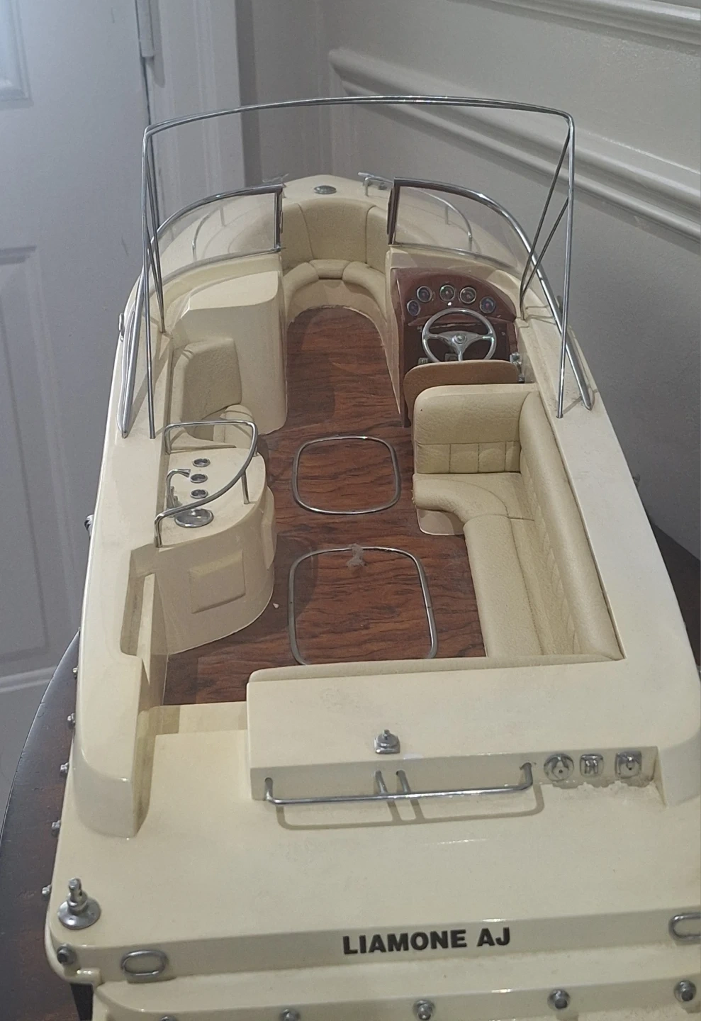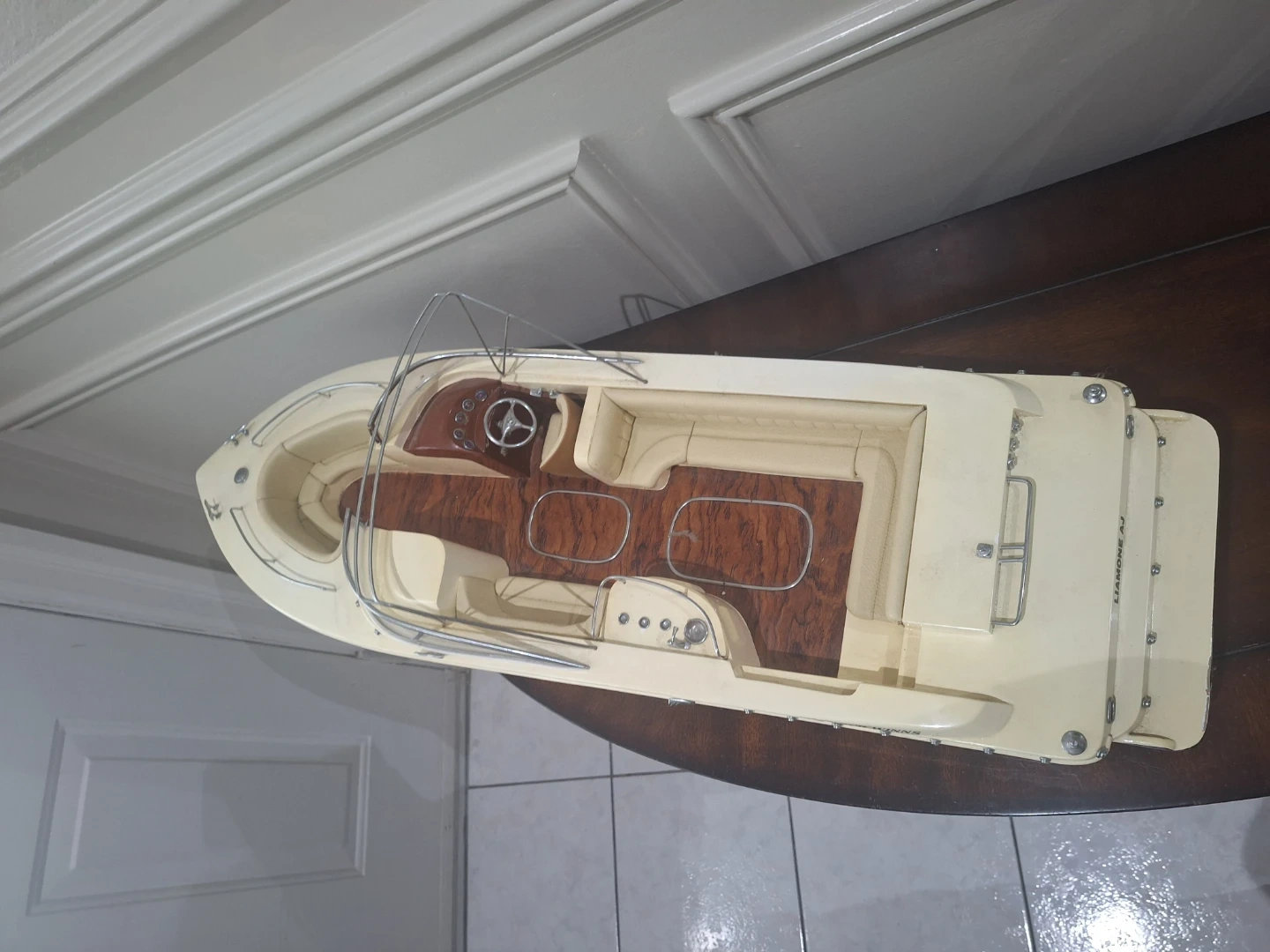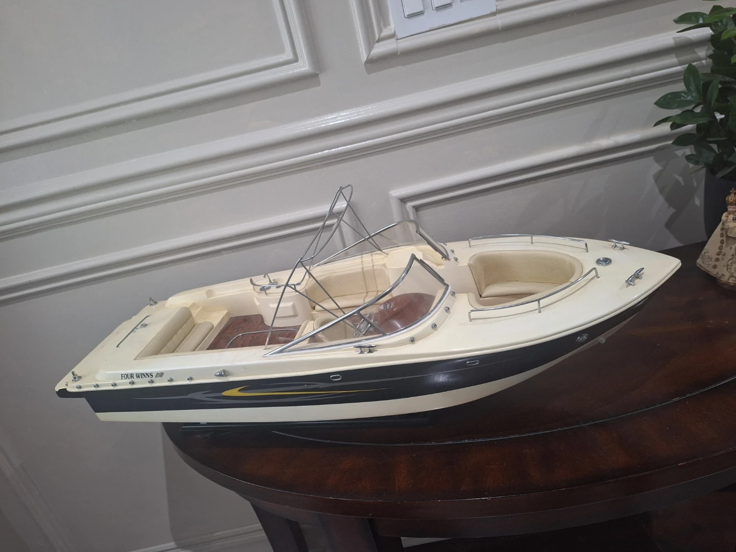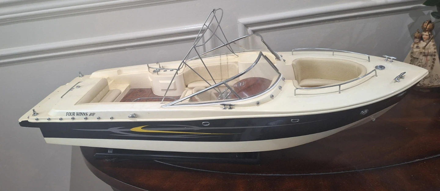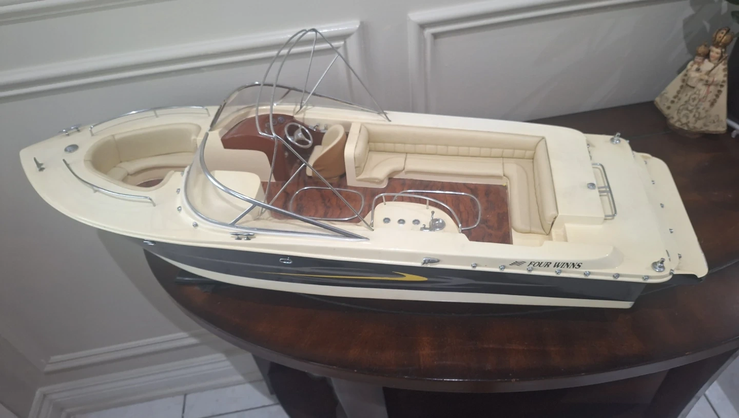 This is a model of a Four Winns boat. It has detailed interior seating and a wooden-look floor. The model features a steering wheel and windscreen.