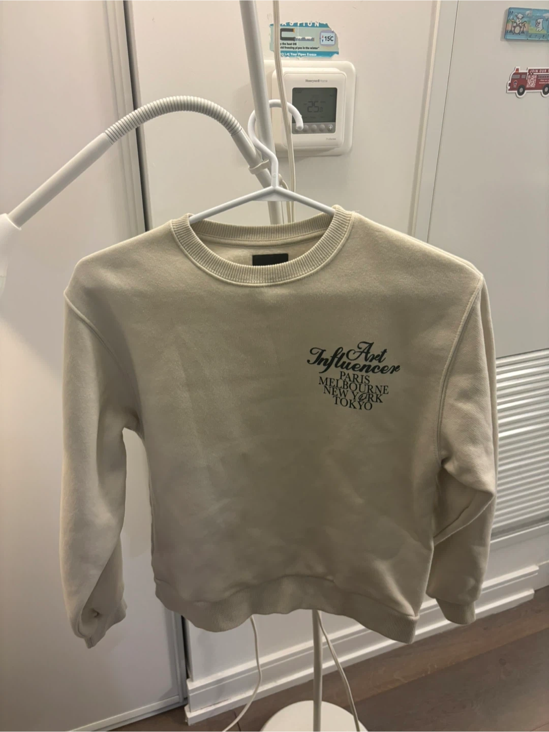 Cream coloured crewneck sweatshirt with a graphic print. The print features 'Art Influencer' and lists various cities like Paris, Melbourne, New York, and Tokyo. It's a comfortable crewneck style.