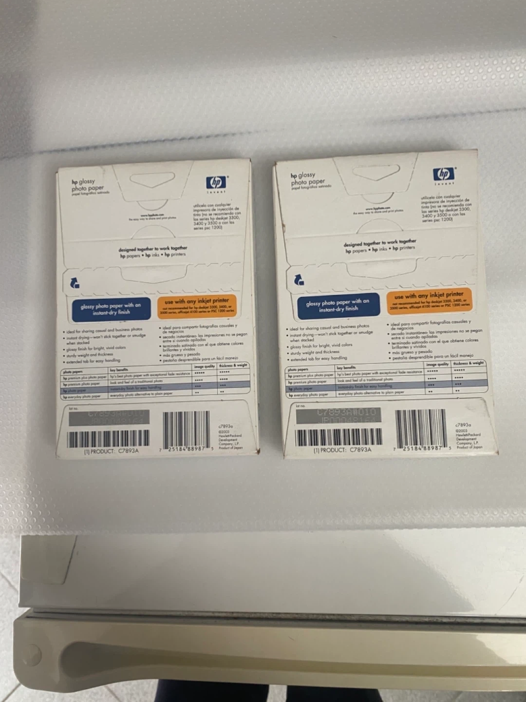 Two packs of HP glossy photo paper. Each pack contains 60 sheets of 4x6 inch photo paper. It's designed for inkjet printers and has an instant-dry finish. Paper weight is 175 g/m².