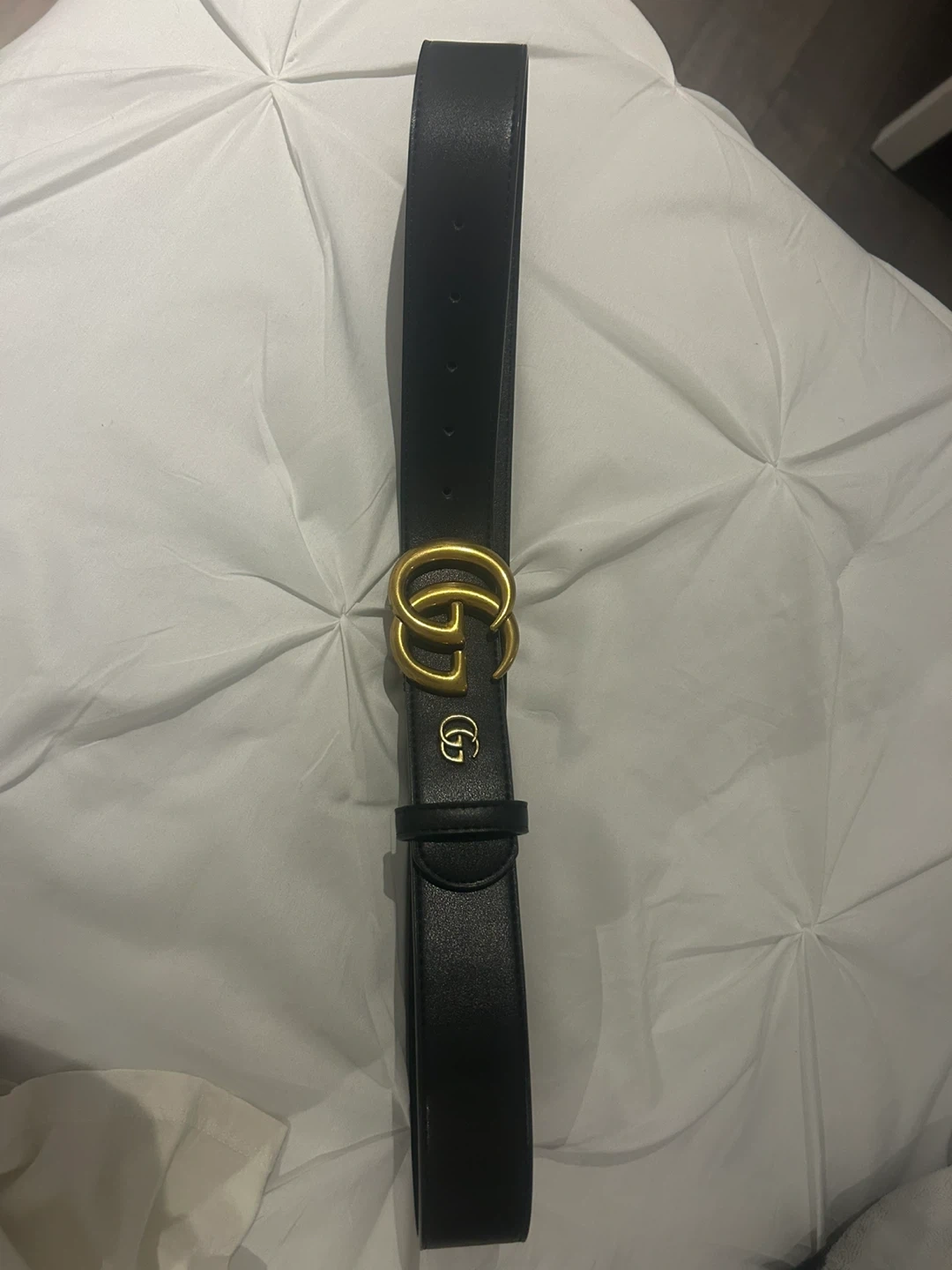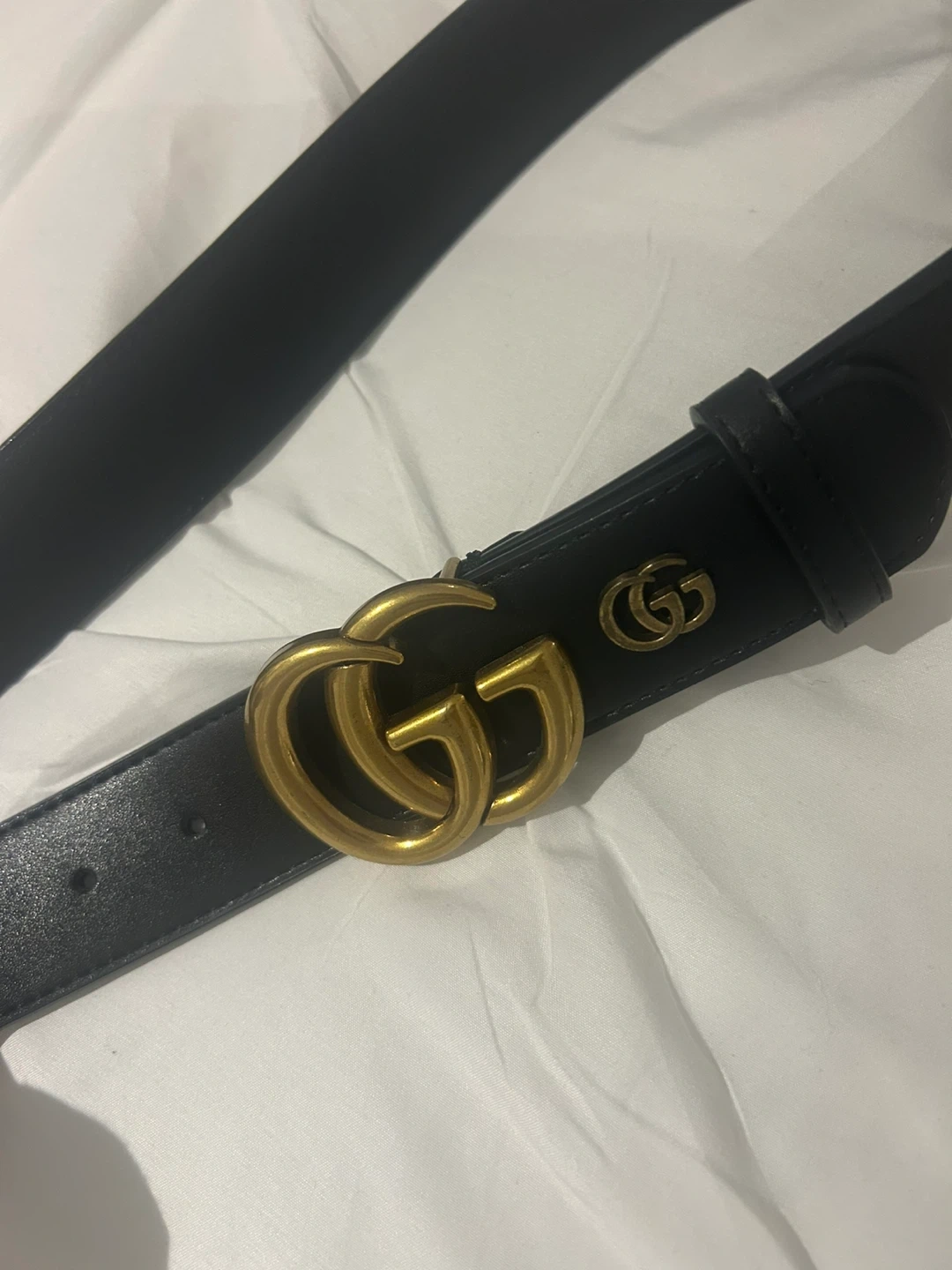 10Selling a classic Gucci inspired belt in black! It features the iconic double G logo in gold hardware. A stylish accessory to elevate any outfit. GG Inspired