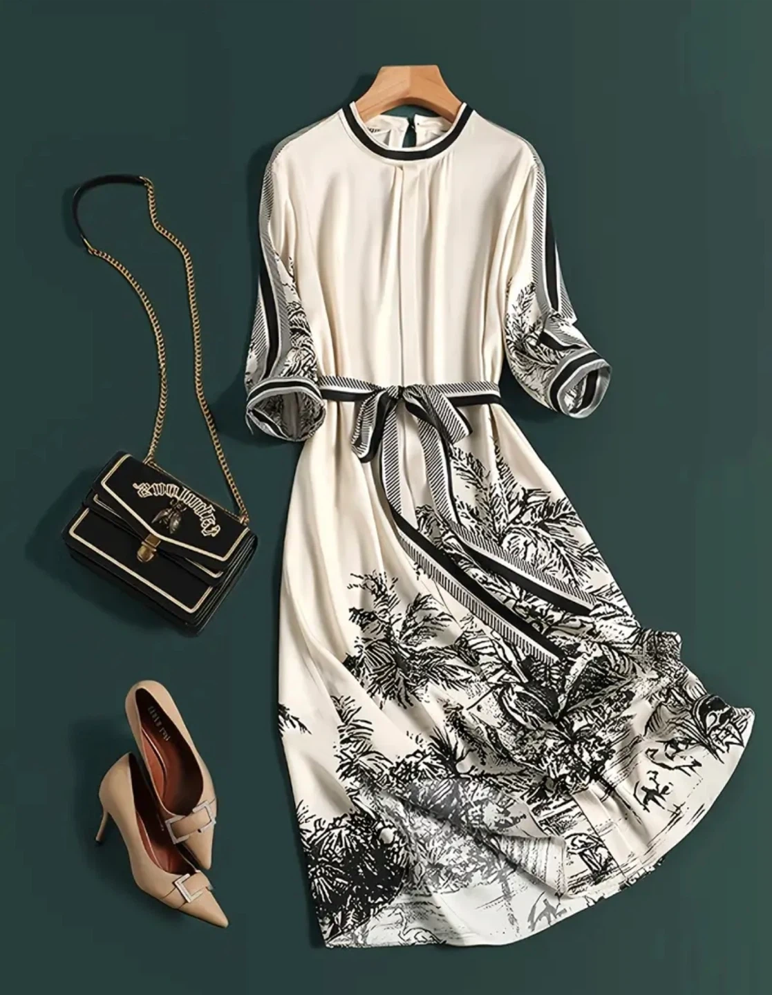 A cream-coloured midi dress featuring a black floral and palm leaf print. It has a round neckline with a black trim and a matching black and white striped belt. The sleeves are three-quarter length with a flared cuff. It's a lovely choice for a dressy daytime event or a casual evening out!