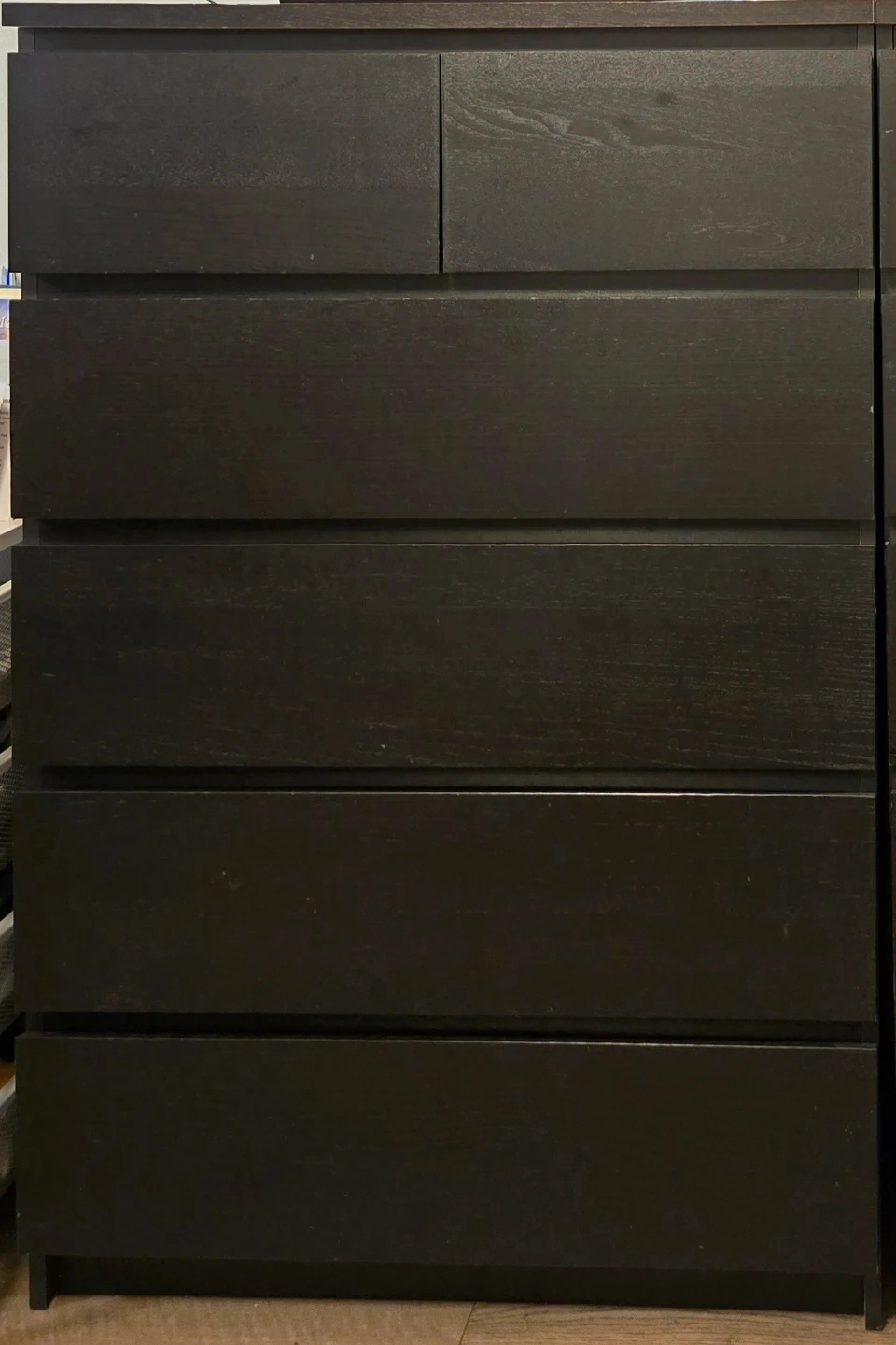 A dark brown dresser with six drawers. It's made of wood composite material. This dresser is useful for storing clothes and linens in a bedroom