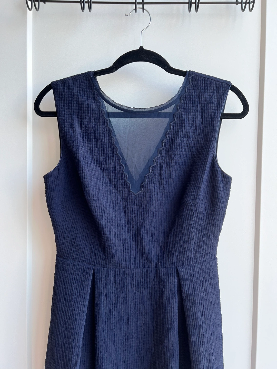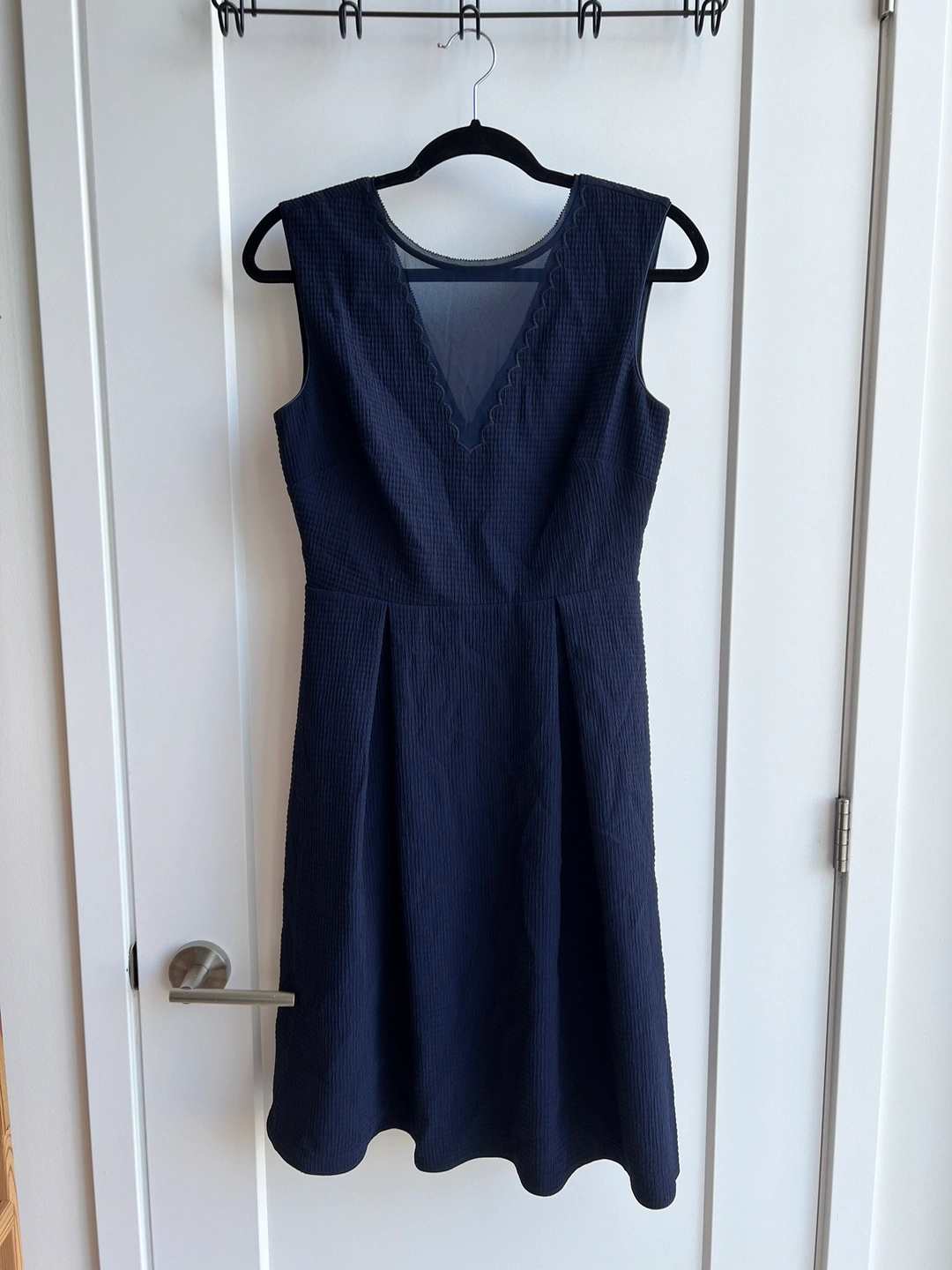 Originally my mom’s but it doesn’t fit her anymore and me neither! There’s no size on the label, but the waist measurement is 28 inches. The V neckline is sheer.