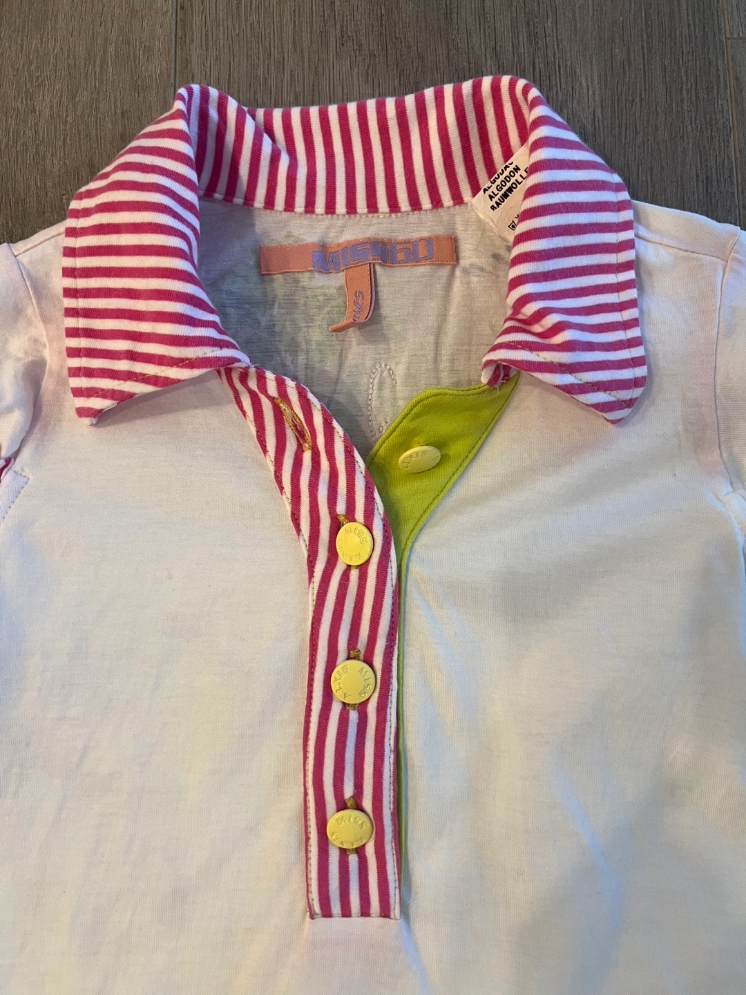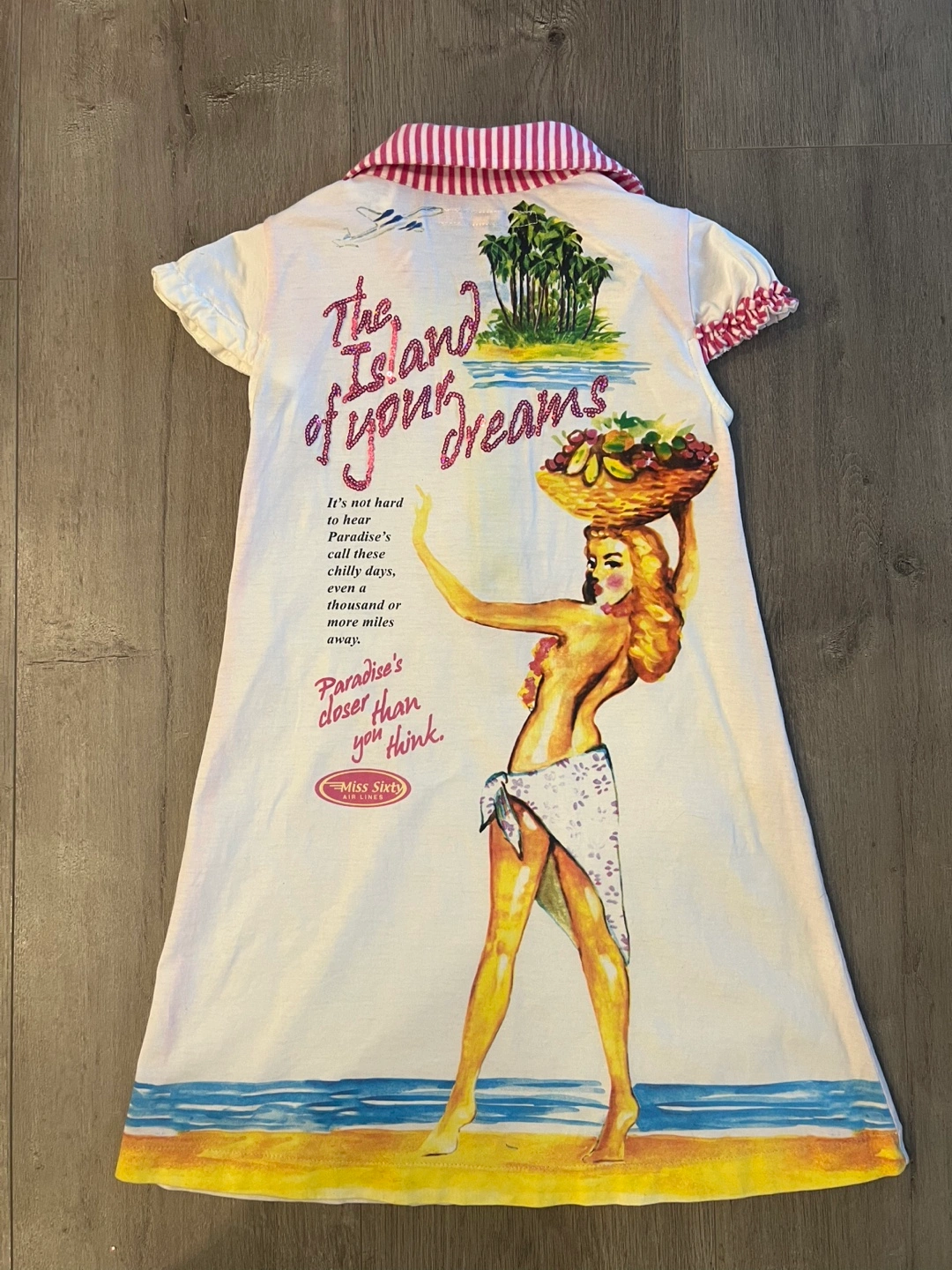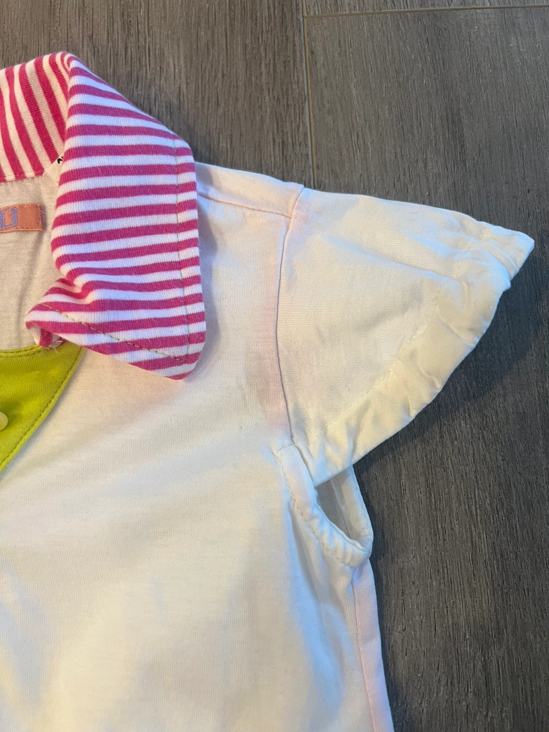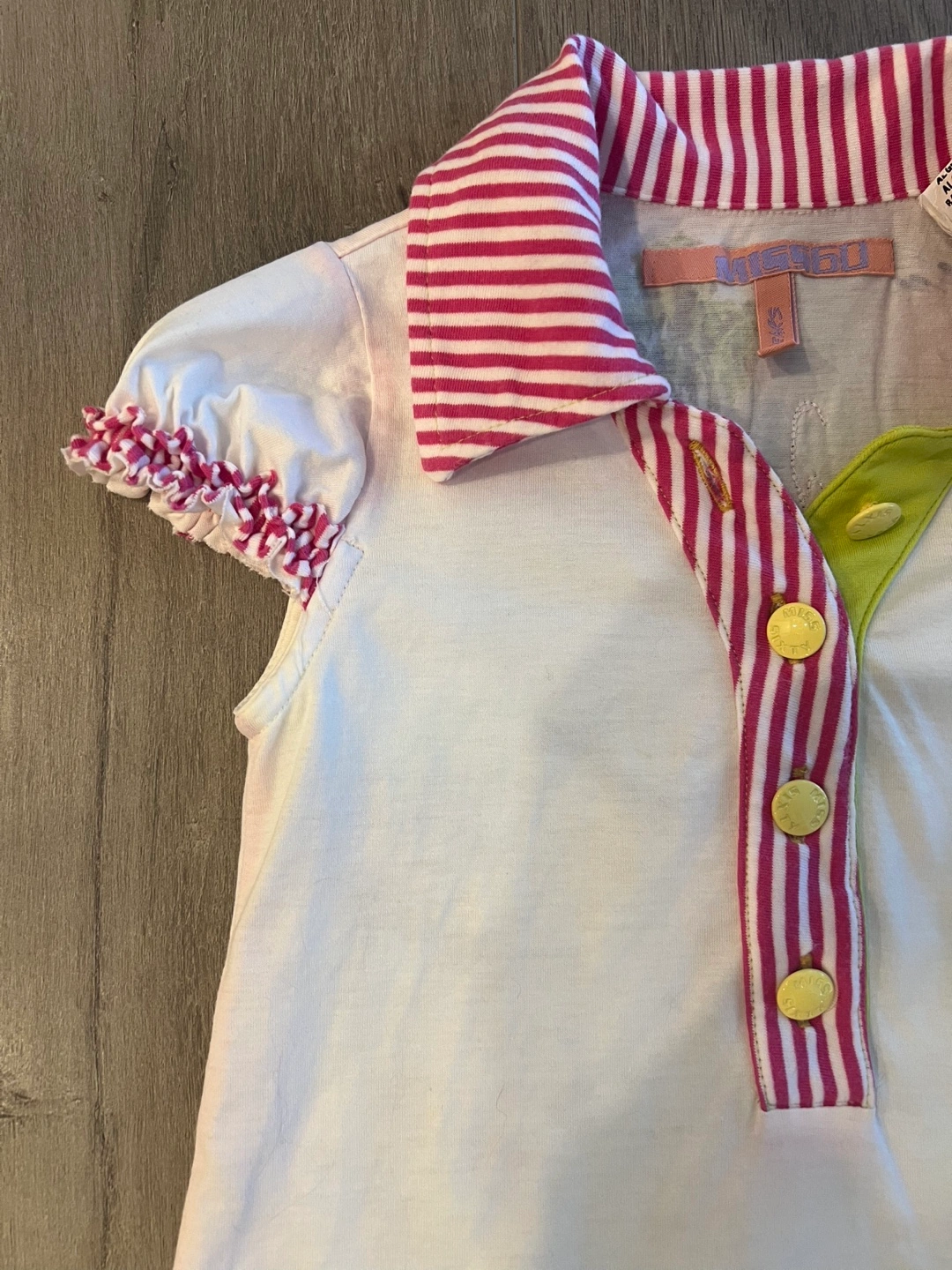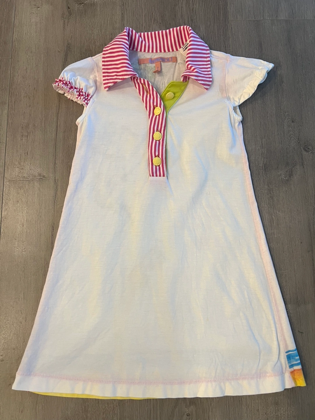 White cotton dress with pink and white striped collar, short sleeves, and yellow button closure. Great unique print on back. Size 4 Years.