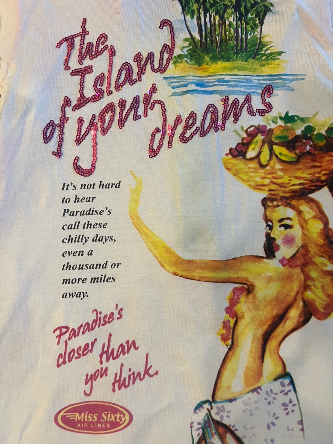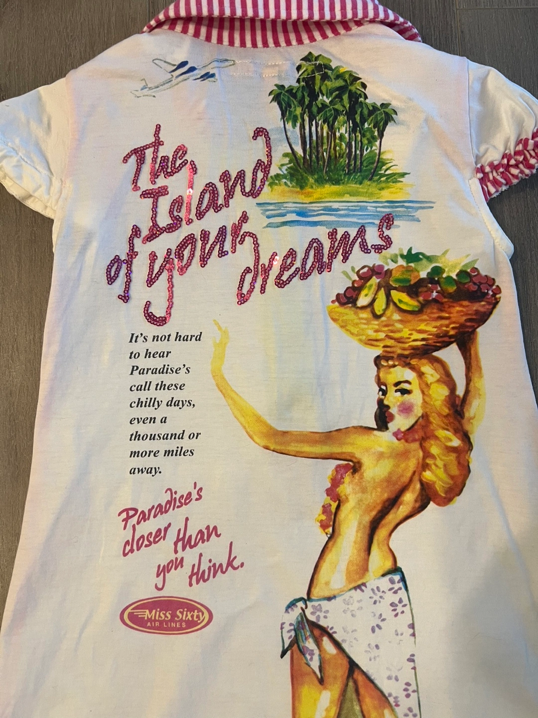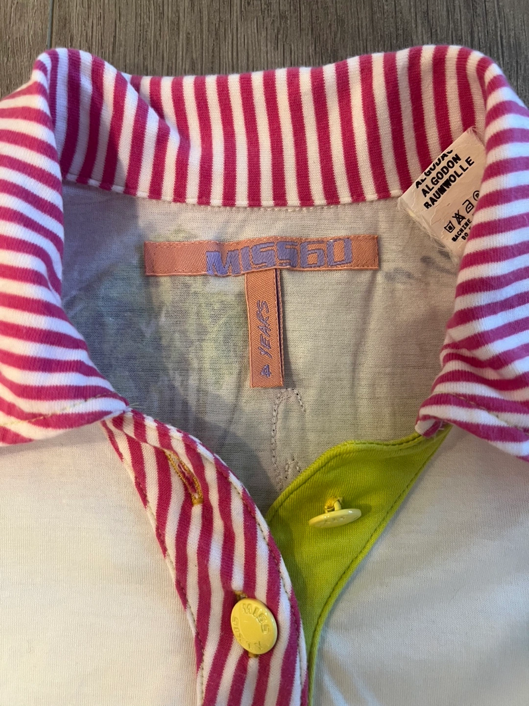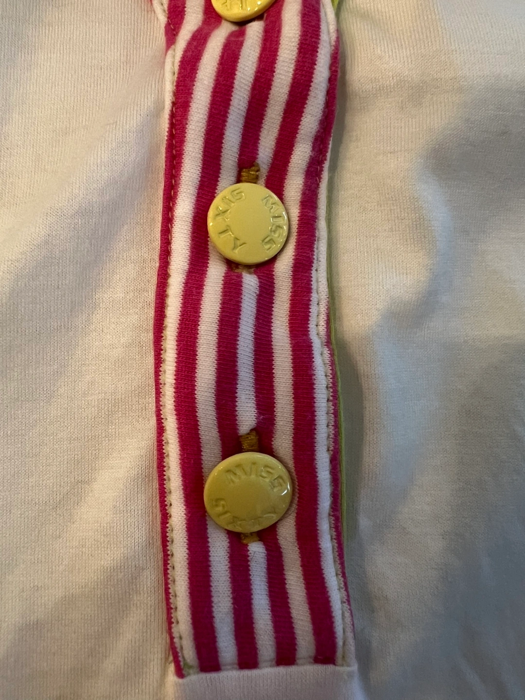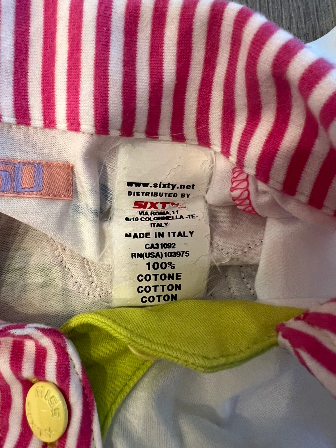 White cotton dress with pink and white striped collar, short sleeves, and yellow button closure. Great unique print on back. Size 4 Years.