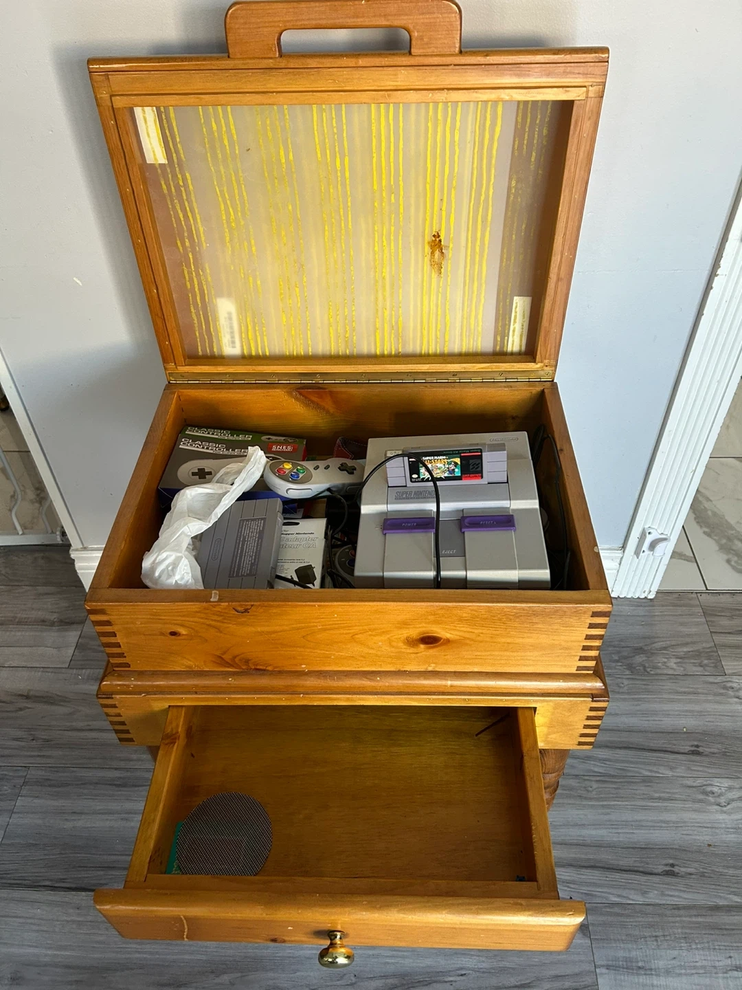 This wooden sewing cabinet has a roll-top design and a small drawer. It includes a Super Nintendo Entertainment System console, a Classic Controller, and a SNES power adapter. Great for organizing sewing supplies and playing classic video games!