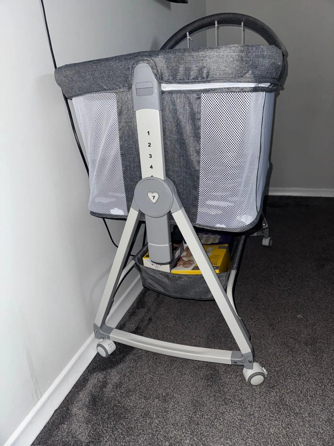 Grey bedside crib with adjustable height settings. It features mesh sides for ventilation and comes with a mattress that has a cute cloud pattern. A mobile with moon and star shapes is attached. This crib is designed for convenience for new parents.