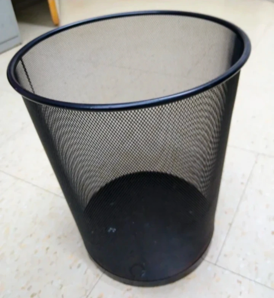 Circular black metal mesh wastepaper basket purchased from Staples.