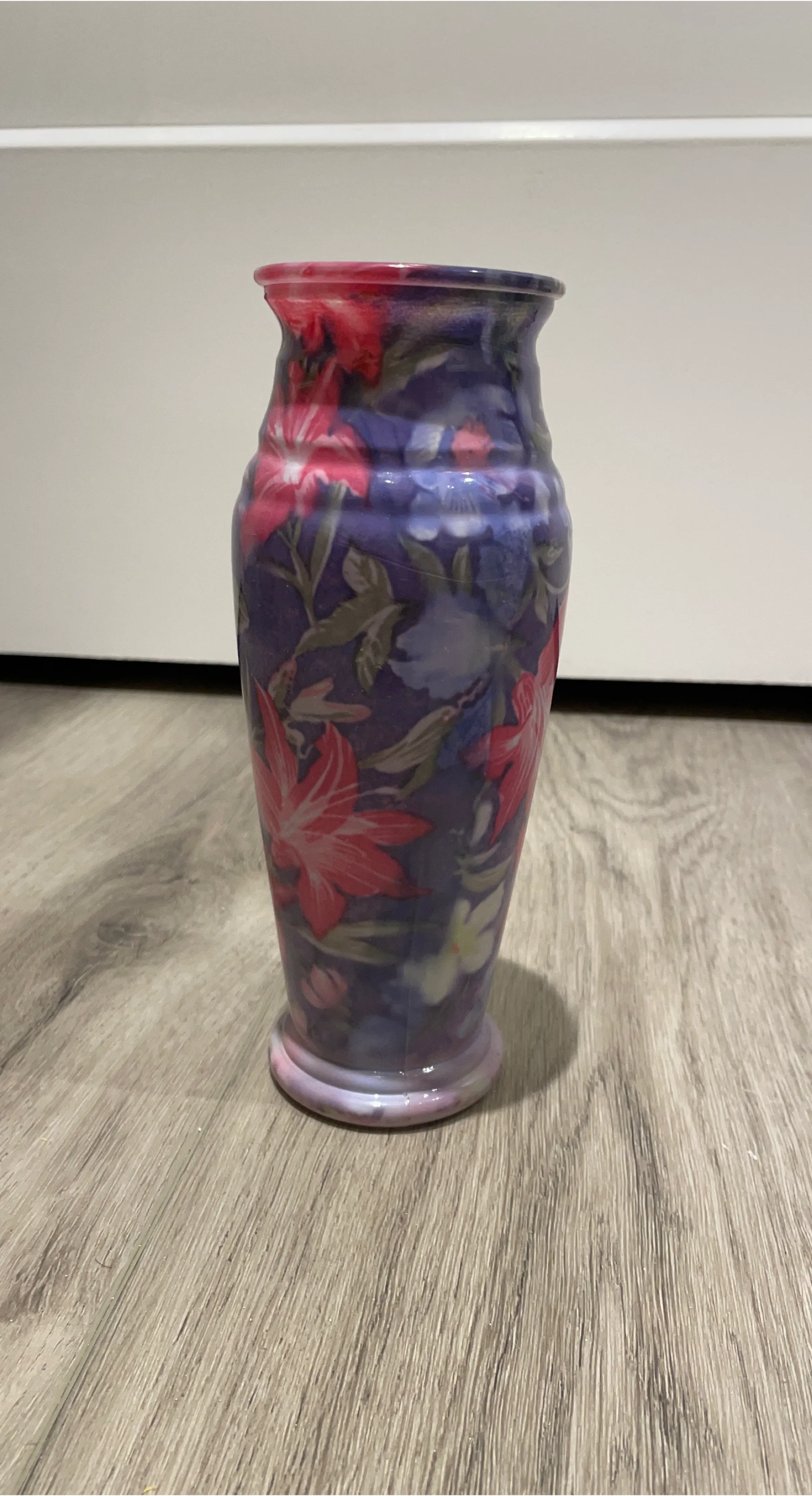 A beautiful ceramic vase with a vibrant floral pattern. It features shades of purple, pink, and green, with a glossy finish. This vase is perfect for displaying flowers.