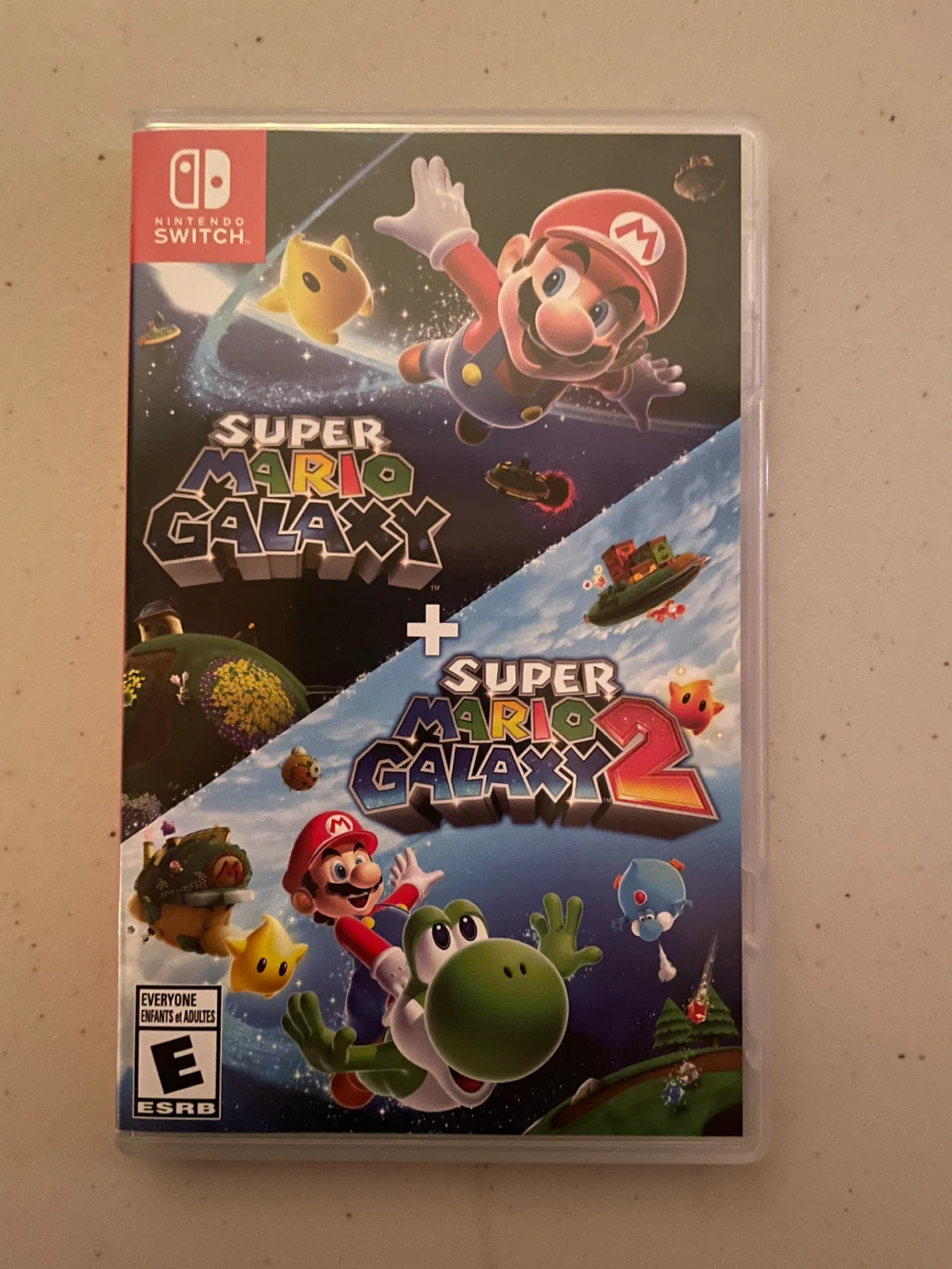 This is the Super Mario Galaxy and Super Mario Galaxy 2 game for the Nintendo Switch. It includes the game cartridge and the original case. The game is rated E for Everyone.