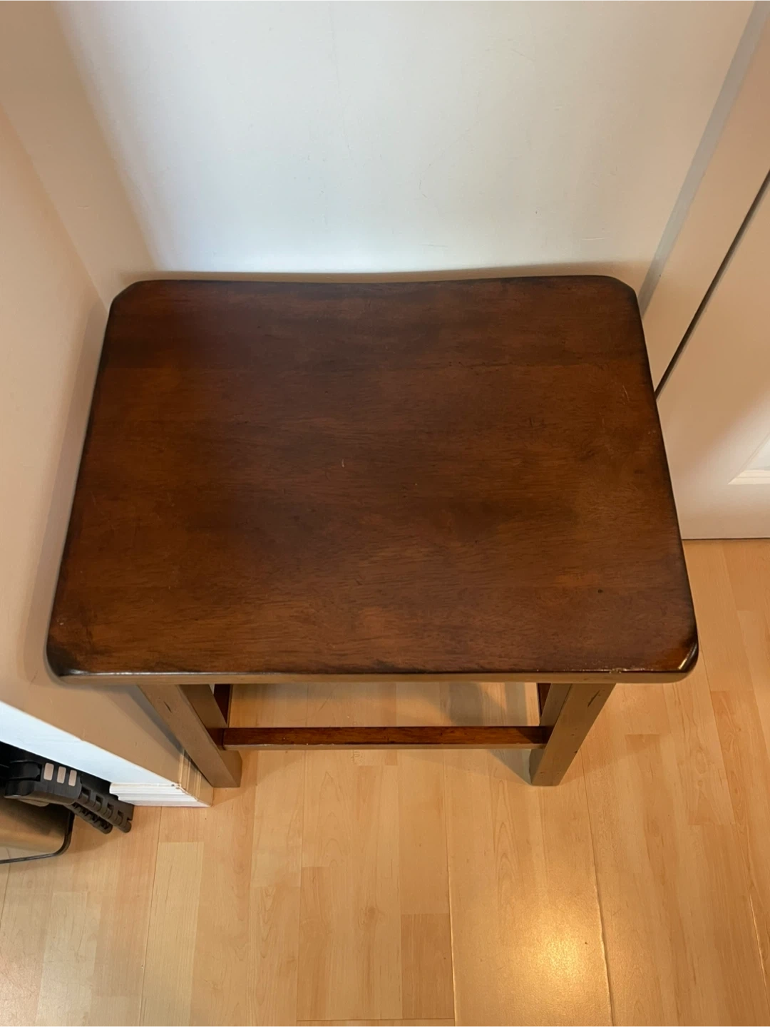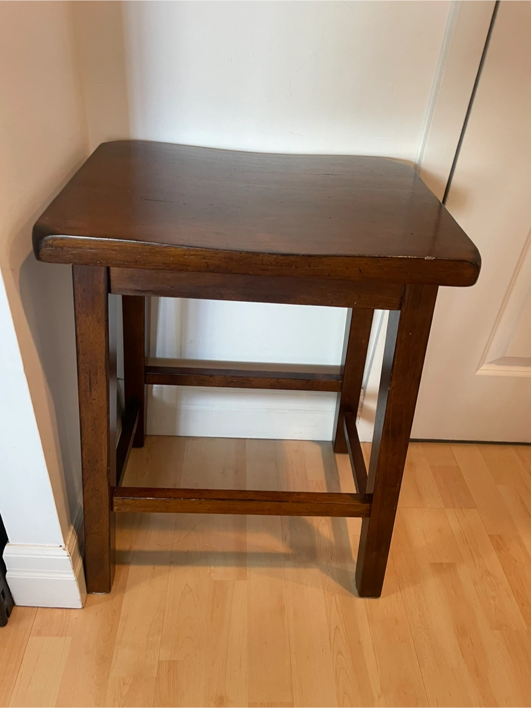 Sturdy wooden stool, with rounded corners to the seat. I used it as an entryway table in a small space- very handy!