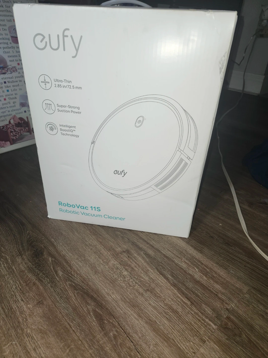 This is a eufy RoboVac 11S robotic vacuum cleaner. It's ultra-thin at 2.85 inches and has super-strong suction power. It uses intelligent BoostIQ technology for cleaning.