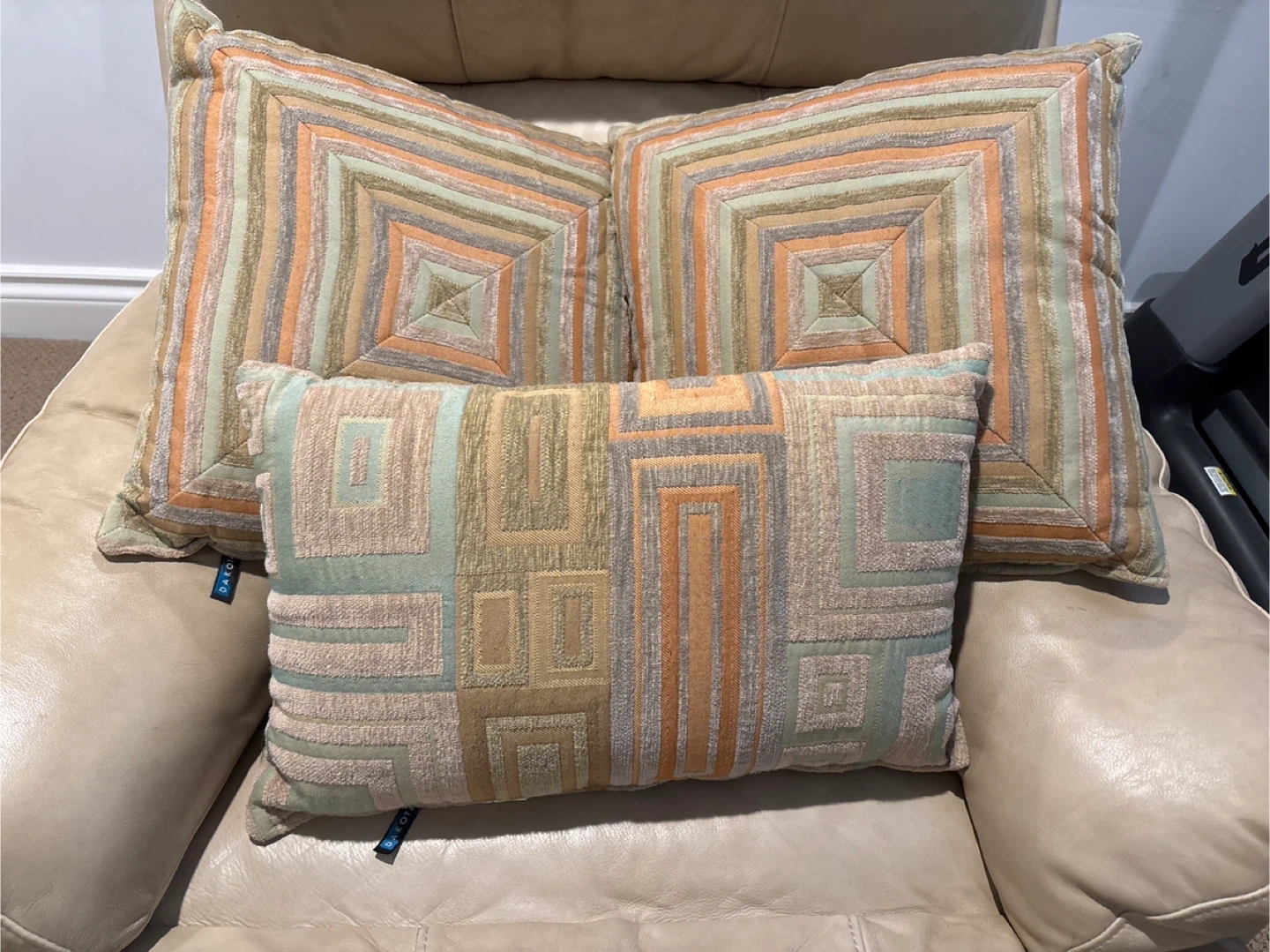 Set of three decorative throw pillows. Includes two square pillows and one rectangular lumbar pillow. Geometric pattern in earth tones with accents of orange and teal. No holes, tears or stains.