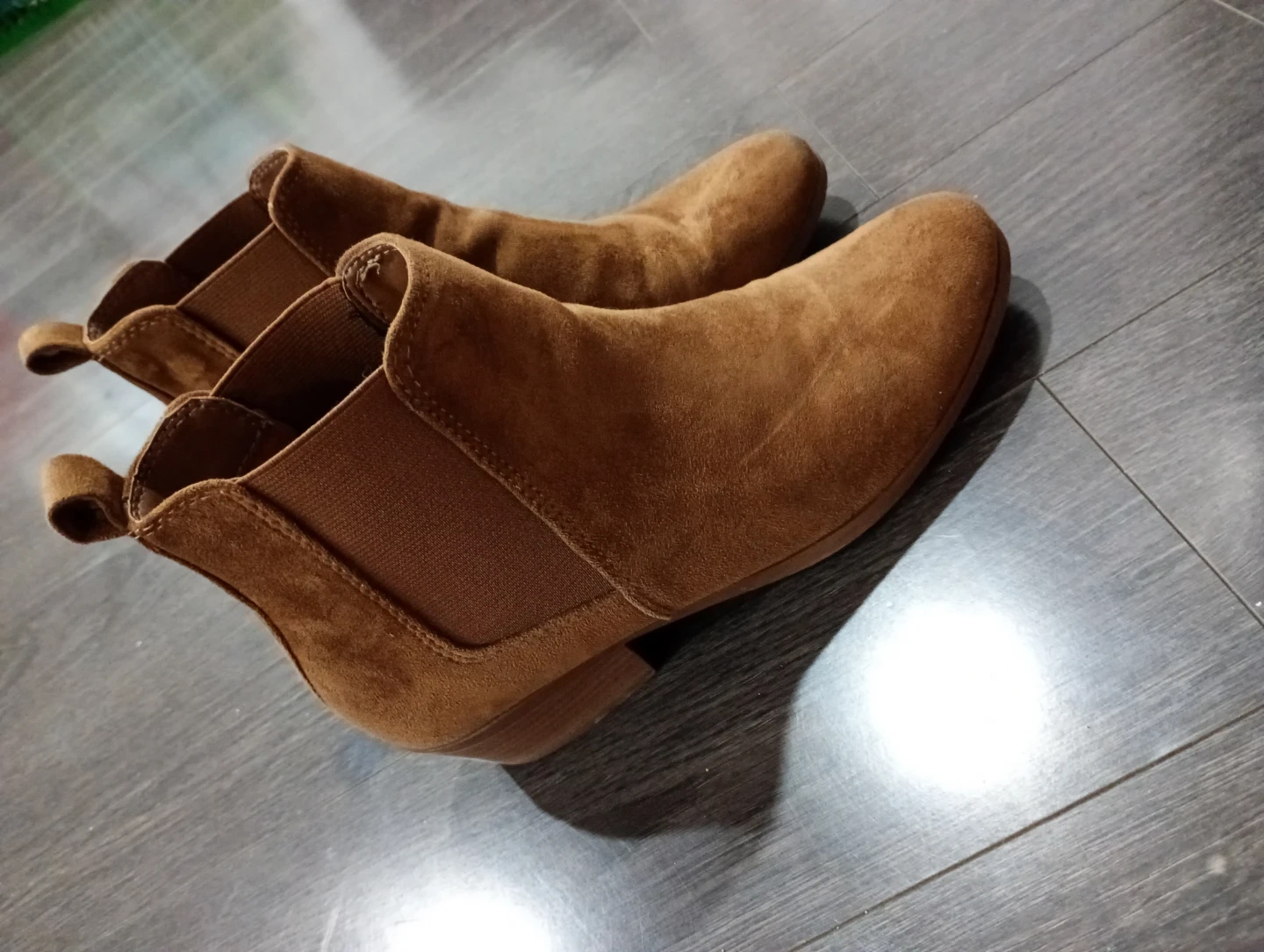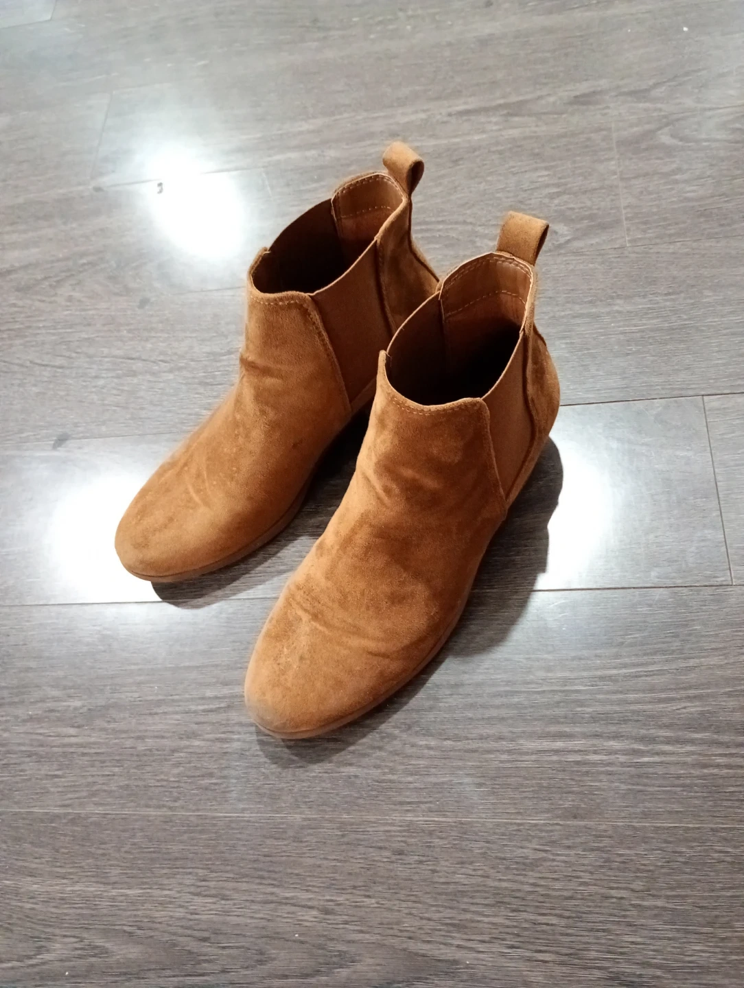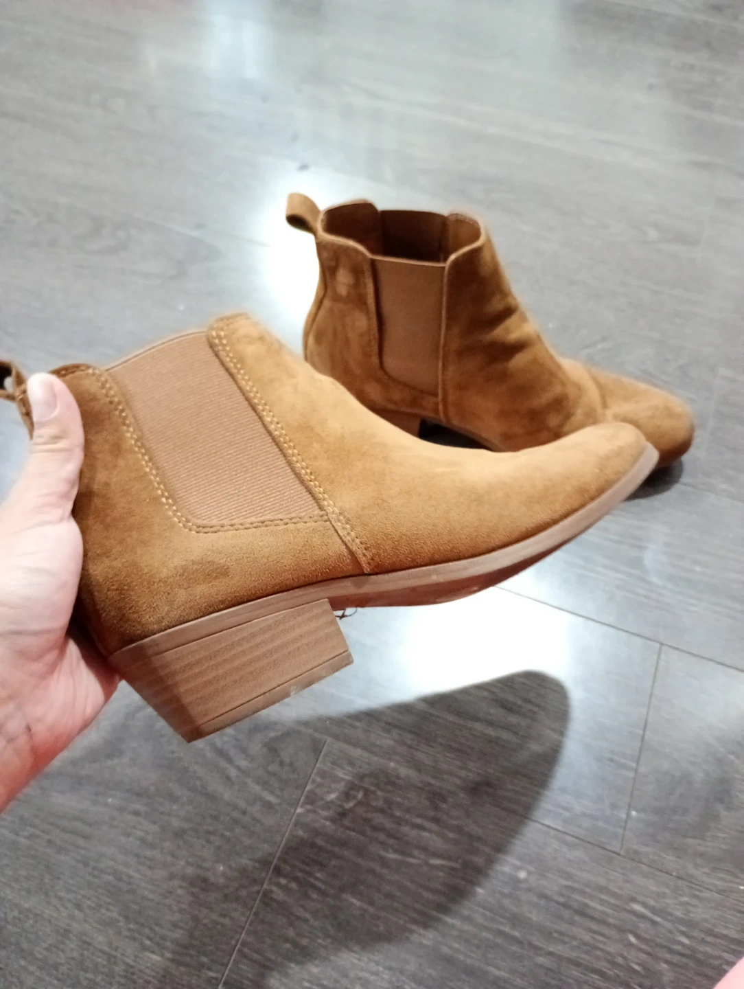 Comfy brown suede Chelsea boots with elastic side panels. They have a low heel and pull tabs for easy on and off. Great for everyday wear!
