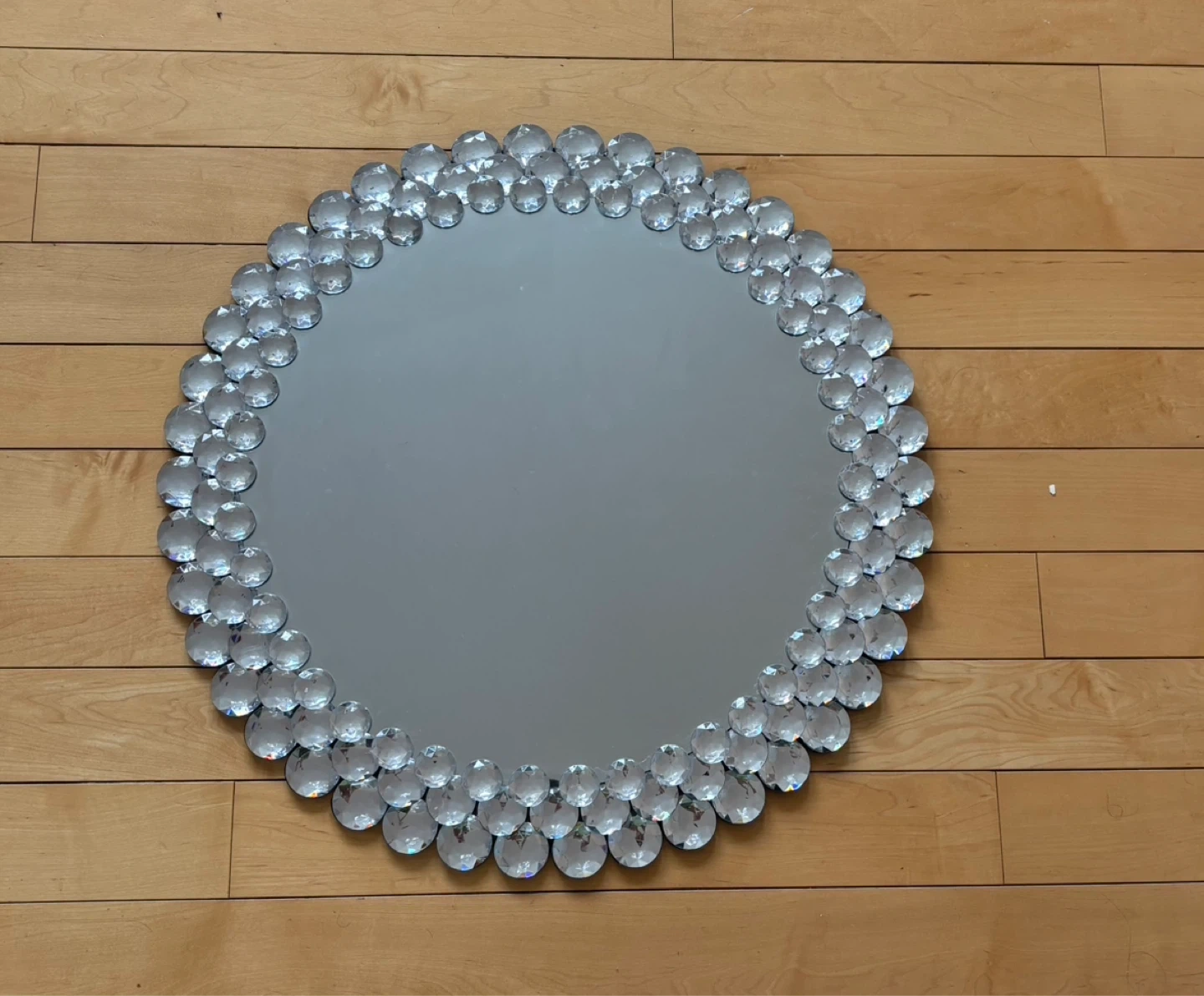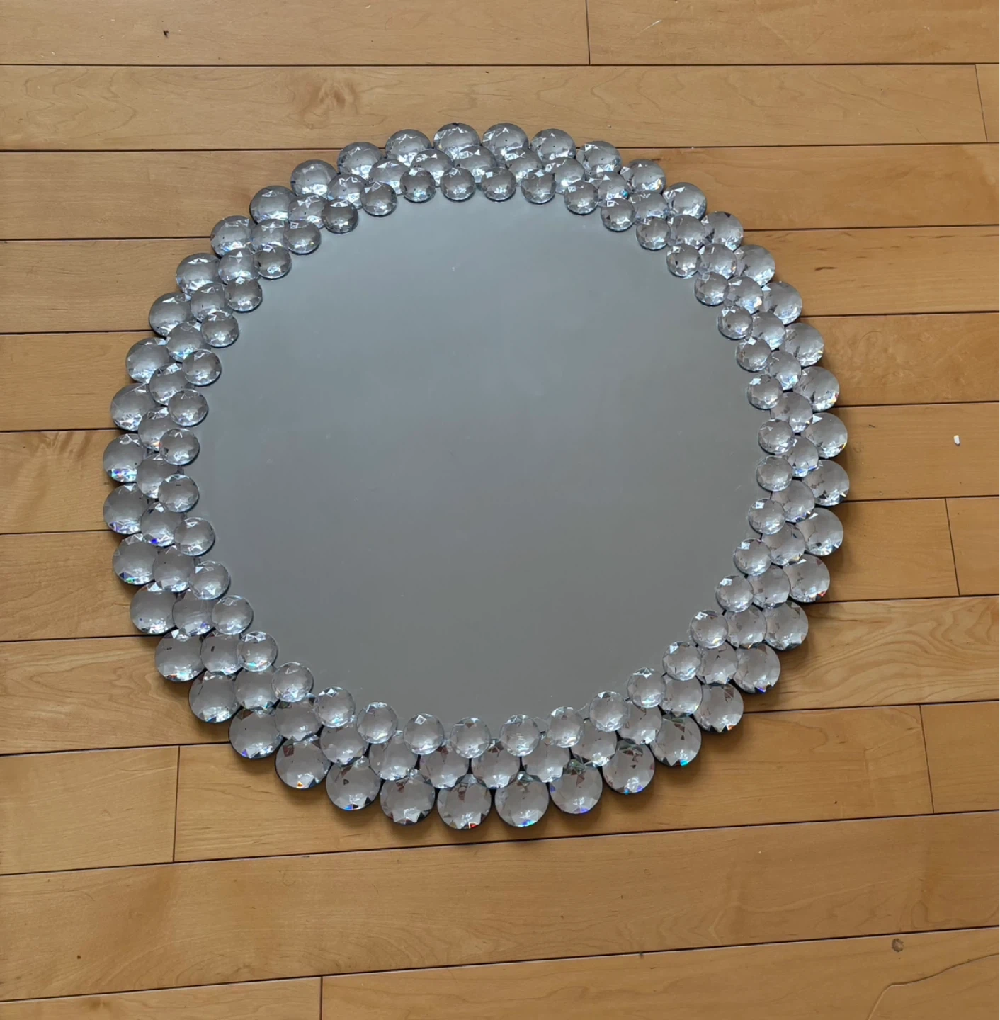 This decorative wall hanging mirror features a border of clear, faceted embellishments. This mirror adds a touch of sparkle to the wall.